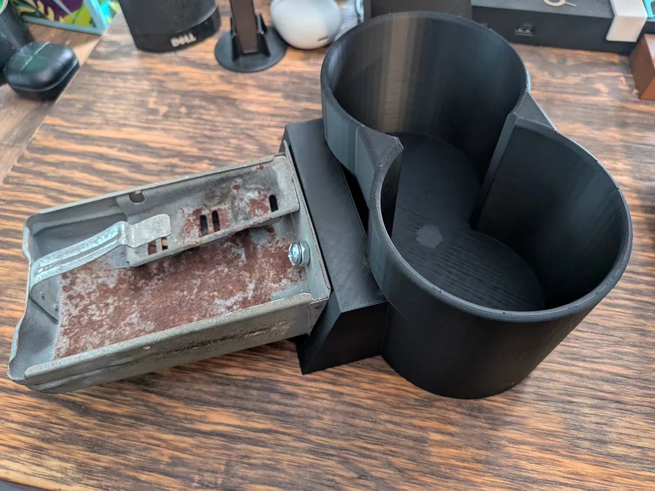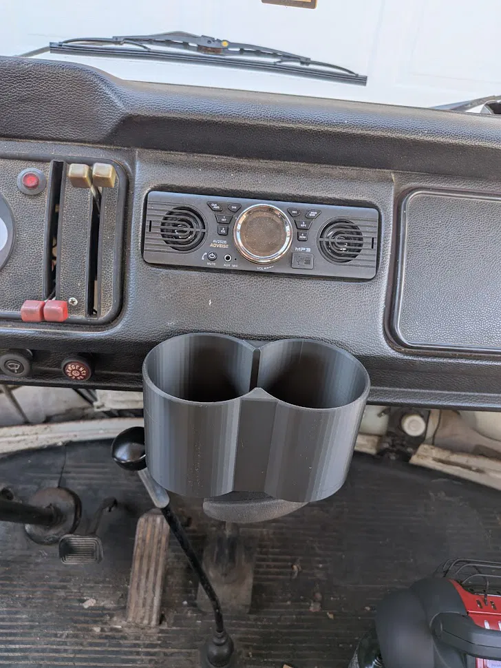 Khay để ly cho 68 VW DoubleCab Transporter. Có thể sẽ vừa với các đời khác nhưng mình chỉ test trên xe của mình thôi. Thiết kế ưu tiên dễ in và độ chắc, và được làm để gắn vào cái gạt tàn (ashtray) zin. Bạn cần tháo một con tán (nut) duy nhất đang giữ mặt ốp (faceplate) của ashtray, rồi gắn khay để ly vào đúng cái lỗ đó. Mình dùng bolt #10, khá khít nhưng trong thiết kế đã chừa khoảng để bạn dùng loại ốc/bu-lông nào bạn có miễn là vừa.