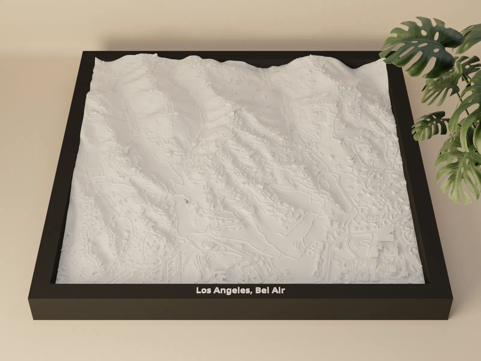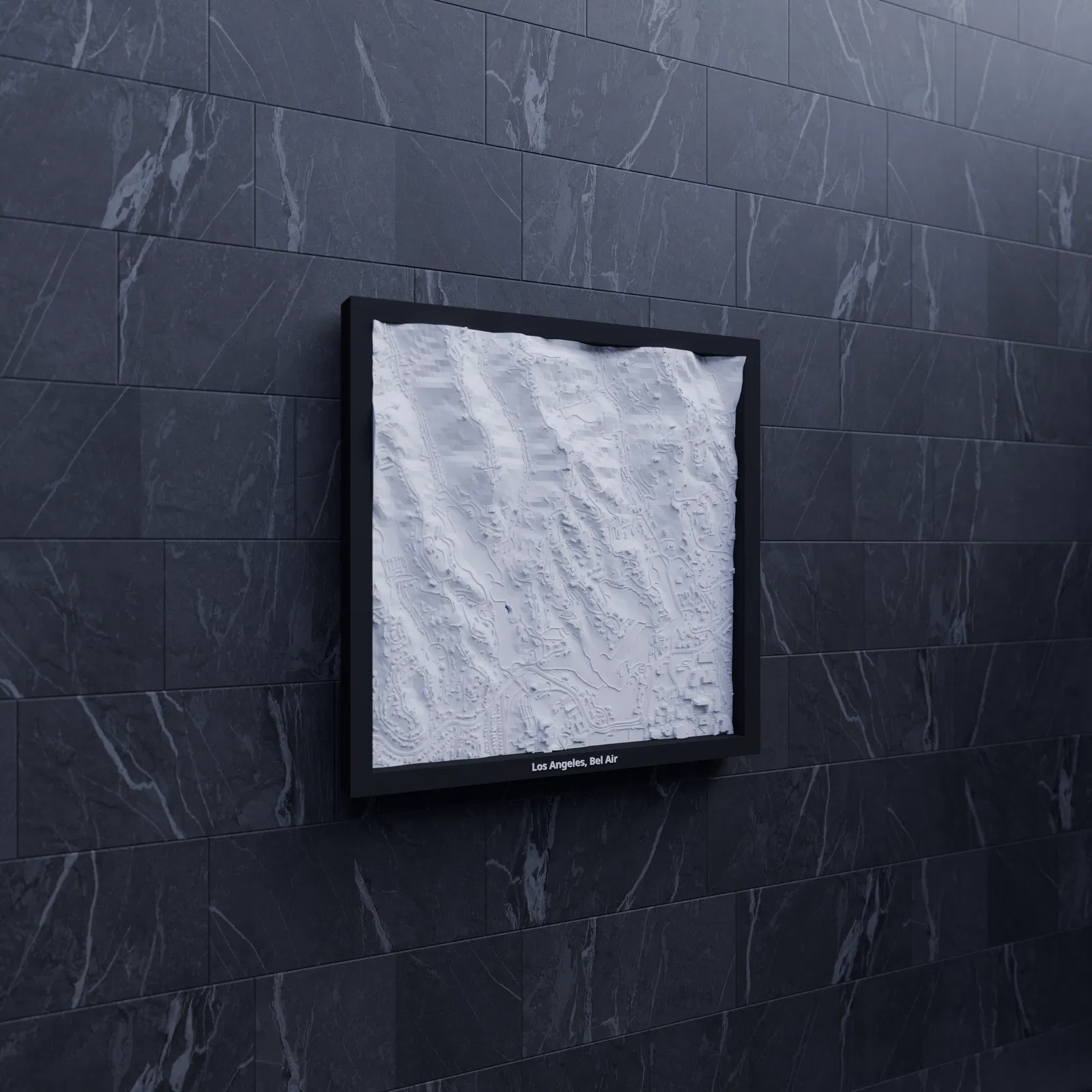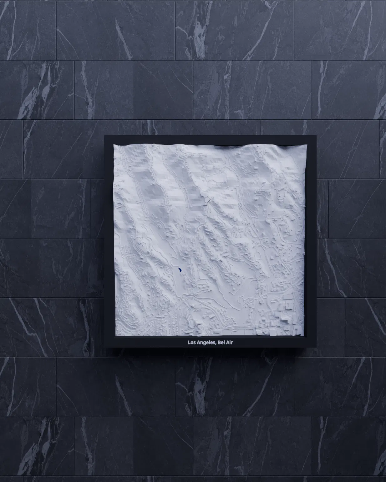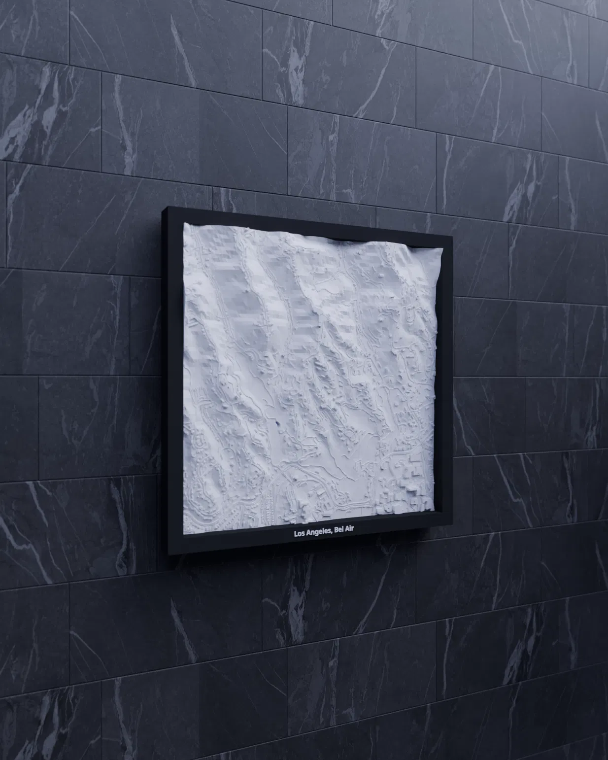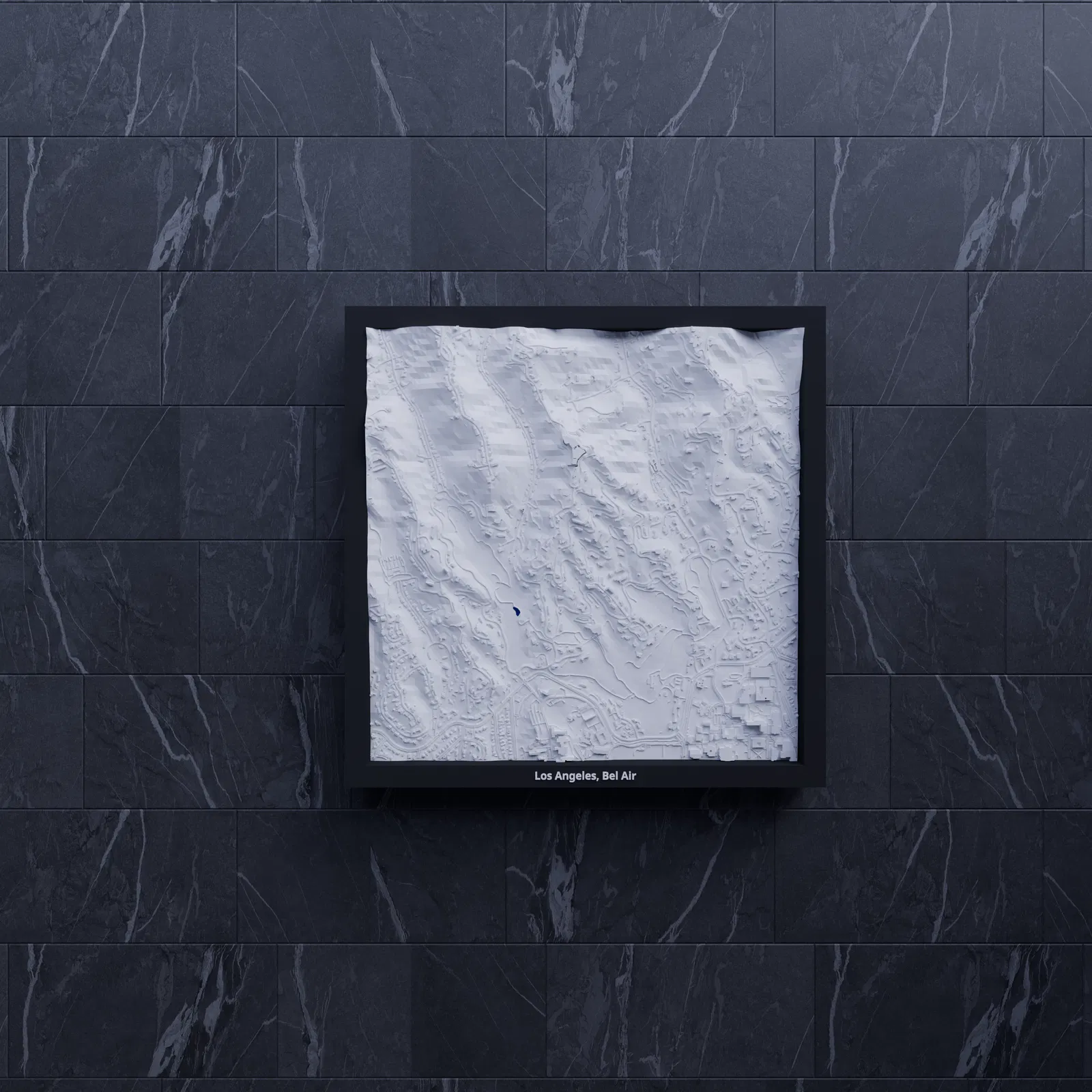 Bản thu nhỏ địa hình 3D của Los Angeles, Bel Air (Hoa Kỳ) dựng từ dữ liệu địa lý, tái hiện terrain chân thực. Kích thước in 200×200 mm, tỷ lệ khoảng ~12014:1. Có nhiều phiên bản frame kèm lỗ treo, phù hợp trưng bày hoặc học tập.