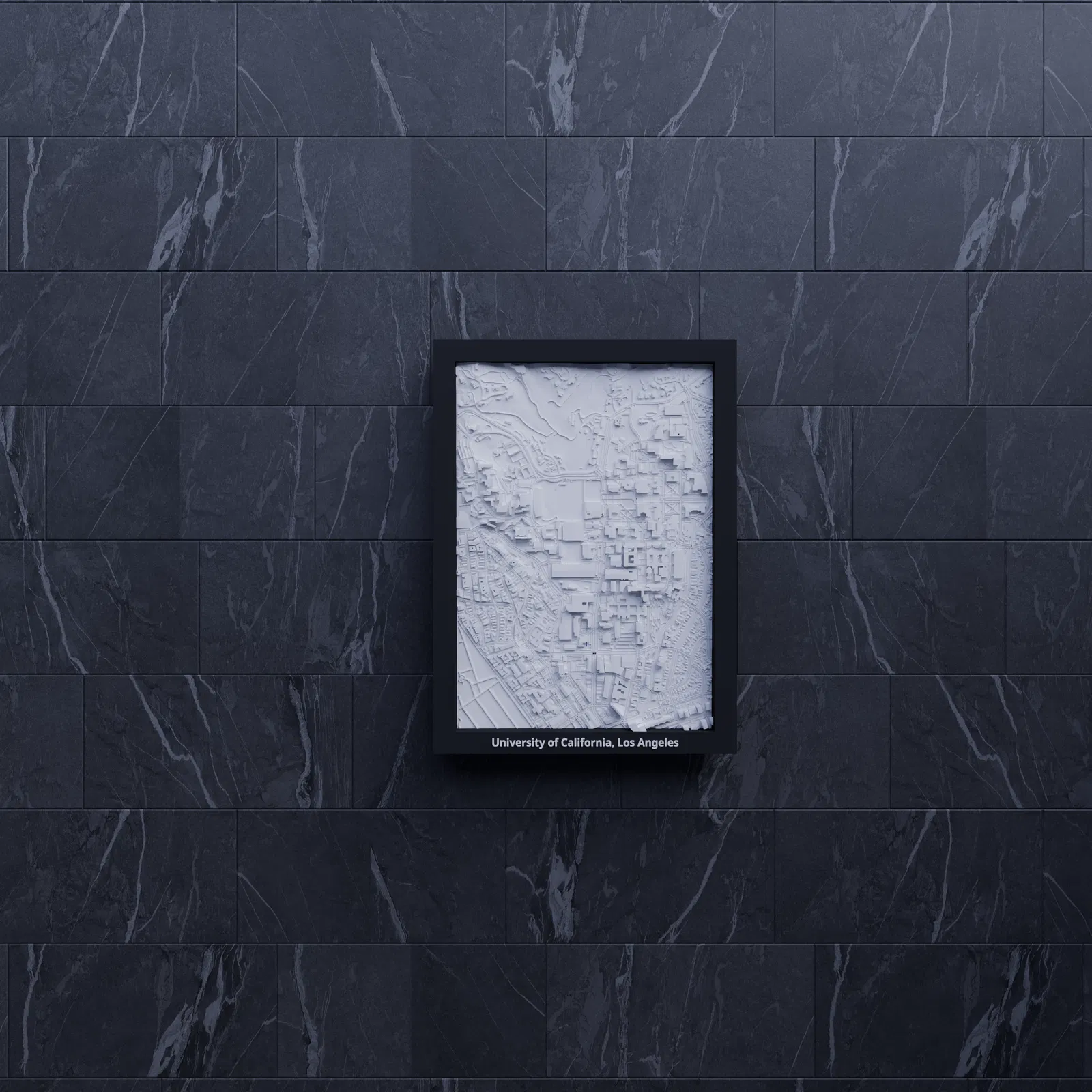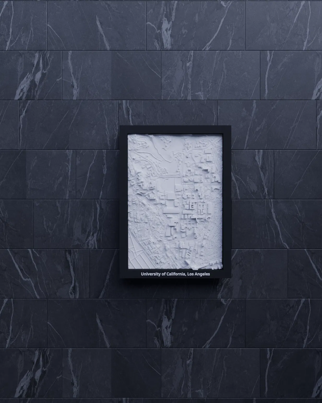 Mô hình địa hình thu nhỏ 3D tái hiện khu vực quanh University of California, Los Angeles theo dữ liệu địa lý, thu nhỏ từ 1.543 x 2.192 km xuống 119.5 x 170.5 mm. Phù hợp trưng bày, học tập và trang trí.