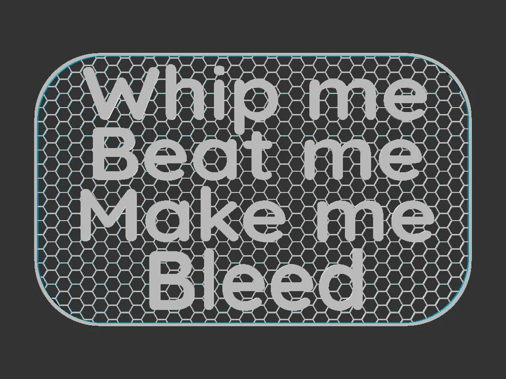 Bảng chữ 100x160mm với nội dung “Whip me, beat me, Make me Bleed”. Có sẵn file Mesh và Solid (dễ in hơn), khuyến nghị đổi màu sau mốc 1mm theo gcode kèm. Có thể lắp vừa Shadowbox Frames.