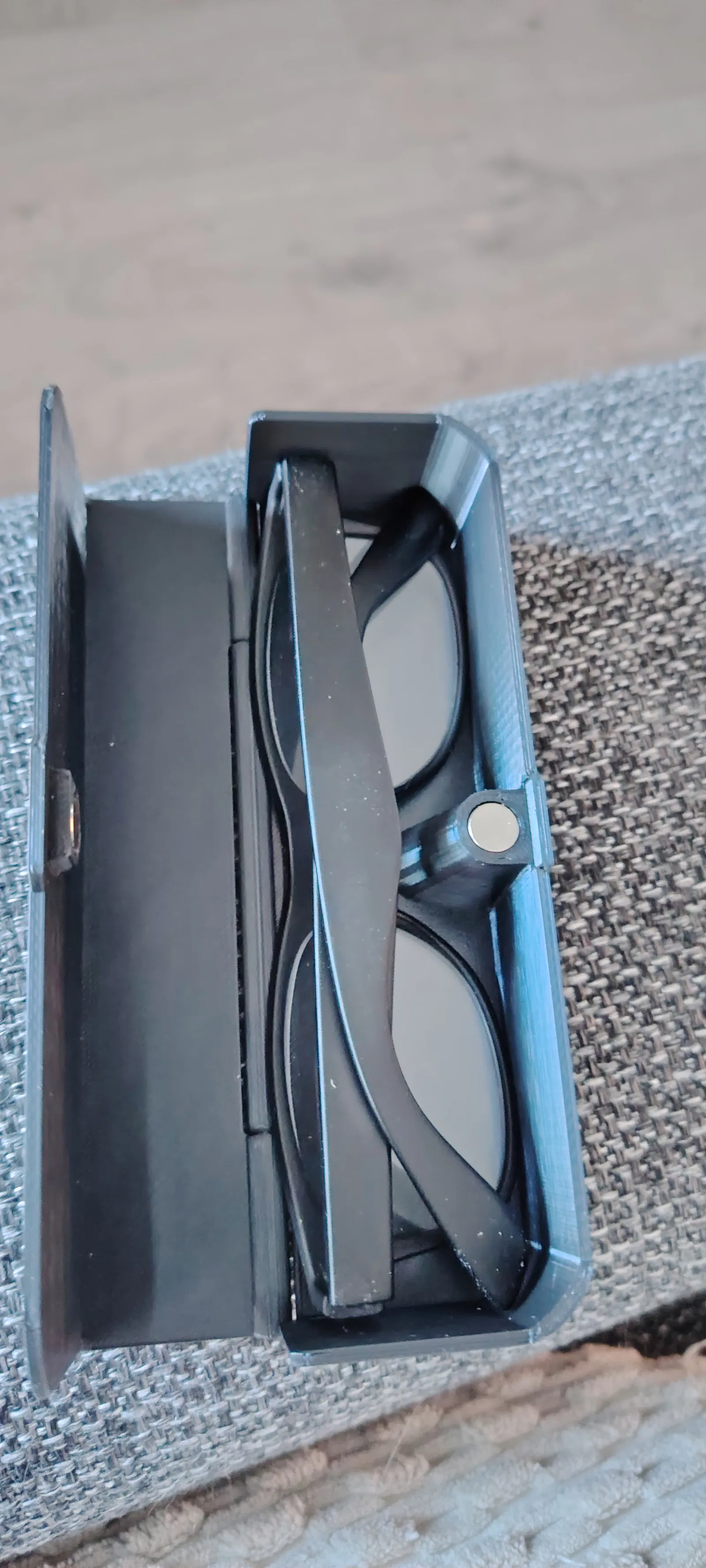 Mẫu hộp đựng kính dạng print-in-place, có khóa nam châm. Thiết kế dùng nam châm tối đa 8x3 mm; chỉ cần in xong rồi dán nam châm bằng keo dán nhanh (instant glue) để đóng mở chắc chắn.