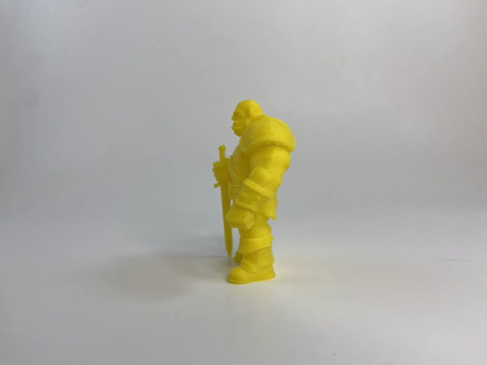 Mẫu mini Orc Warrior/Swordsman phong cách fantasy, hợp để in làm miniature/DnD. Tác giả gợi ý dùng auto tree supports và cân nhắc tăng scale để tránh rung lắc khi in phần kiếm nhỏ, giảm nguy cơ gãy lúc tháo supports.