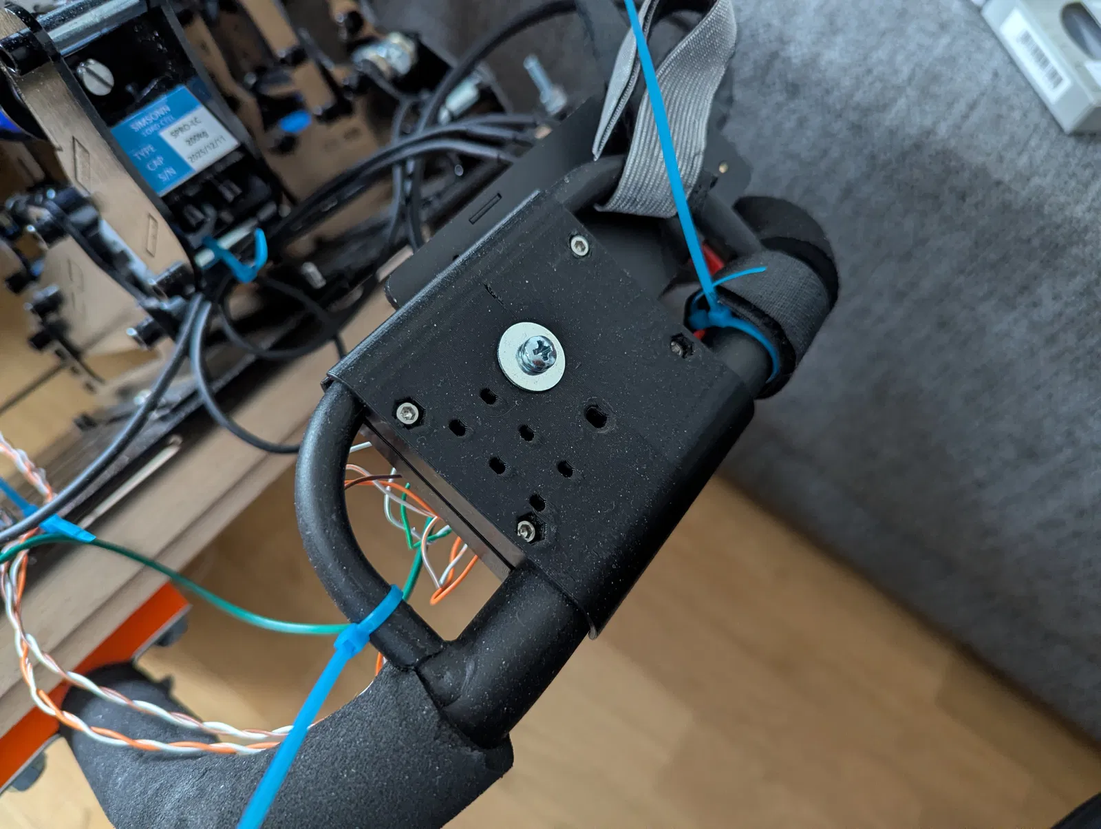 Tấm mounting plate dạng clamp kẹp vào phần tay cầm của pedal holder Playseat Challange, dùng để gắn holder cho khoang điện tử ở cuối giá đỡ bàn đạp. Lắp bằng 4 ốc M3 + ê-cu, có sẵn lỗ và kèm file STEP.