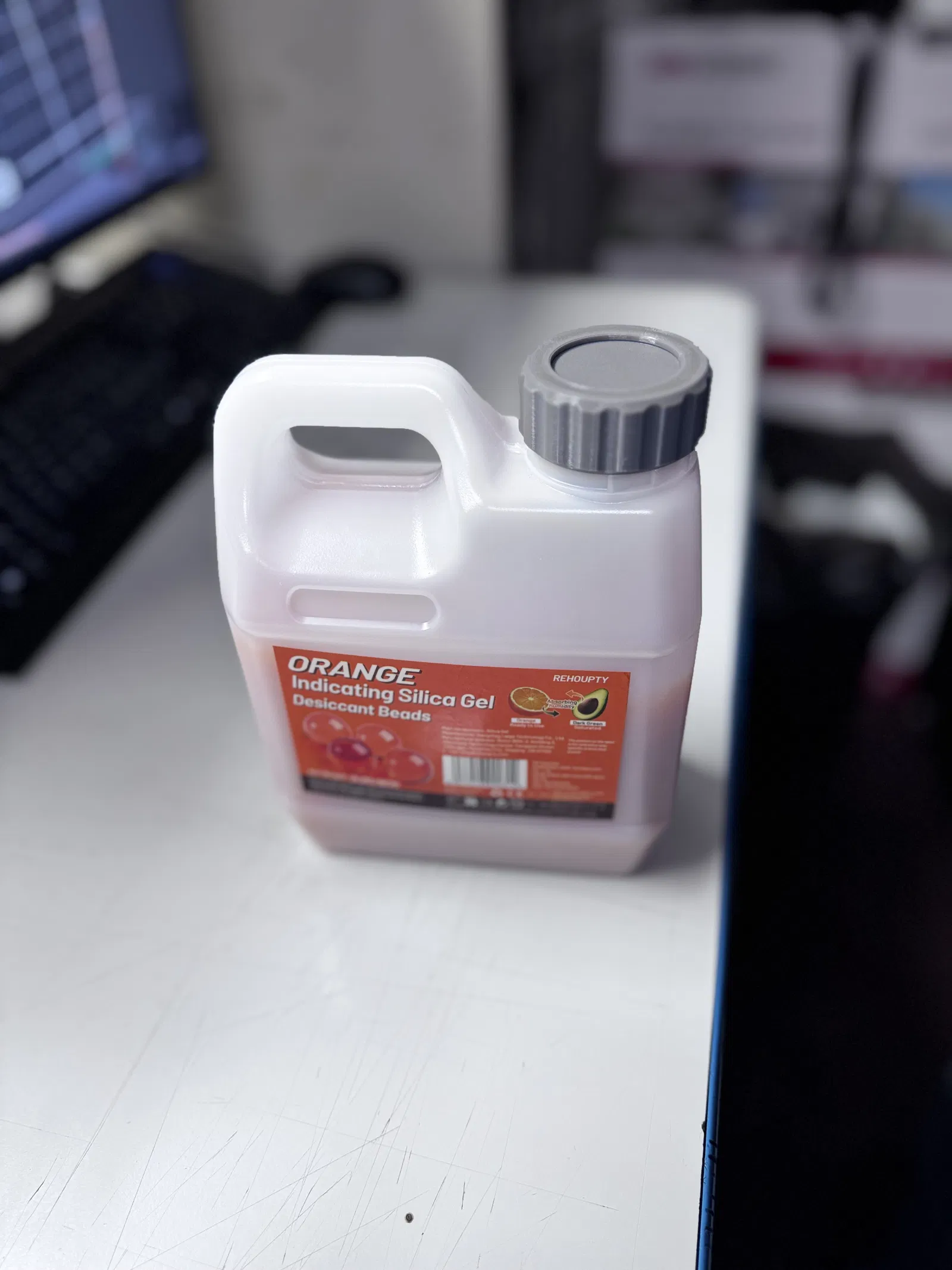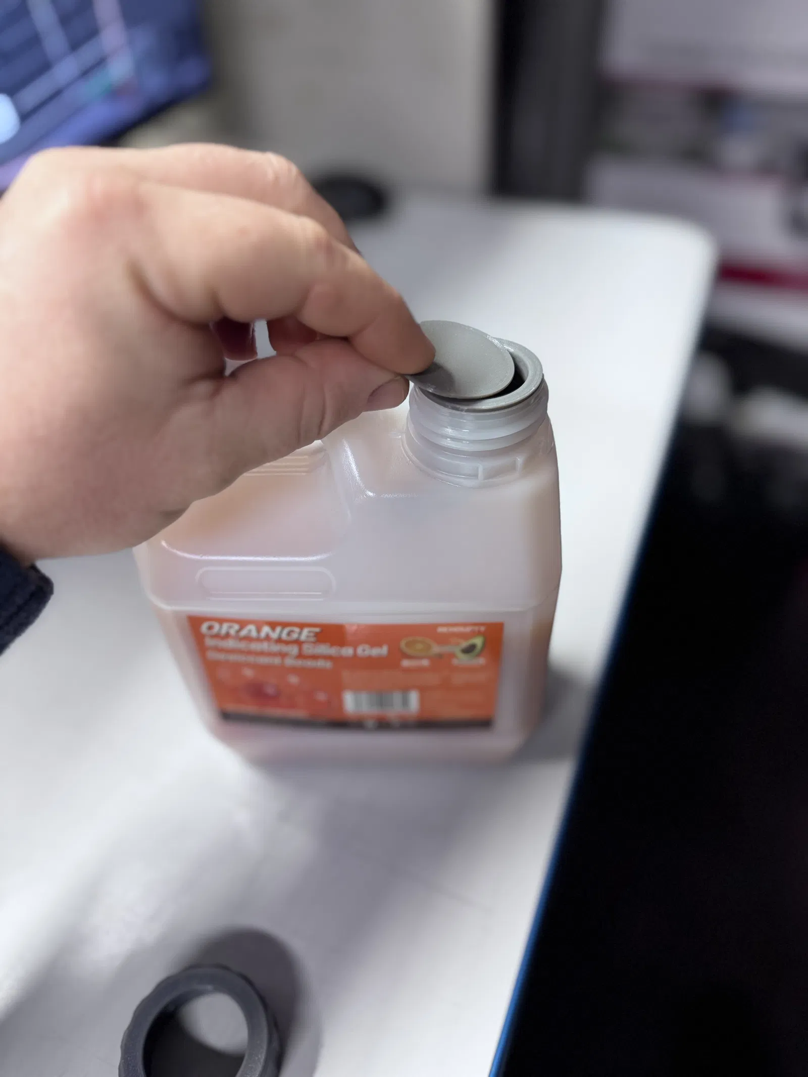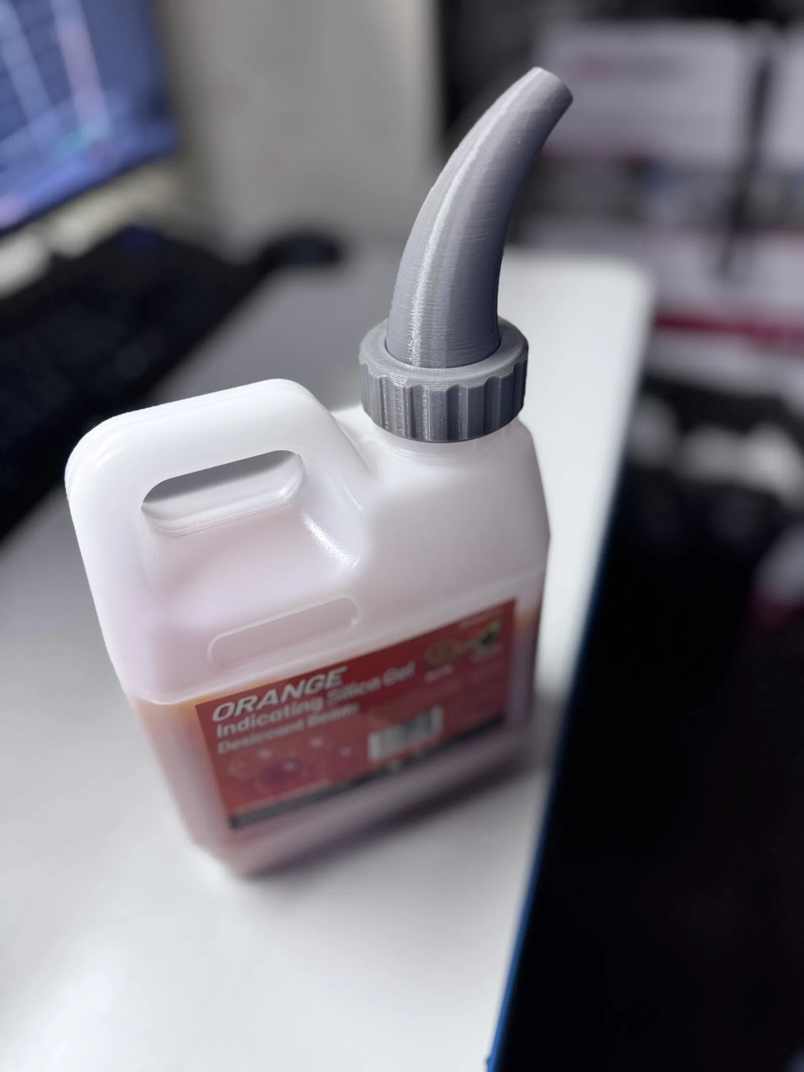 Hệ phễu 3D-printed modular cho hũ silica gel ren M42x4, thay nắp zin để rót sạch, không đổ tràn. Phễu có thể lật ngược và cất gọn bên trong hũ, cố định bằng nắp vặn in kèm theo.