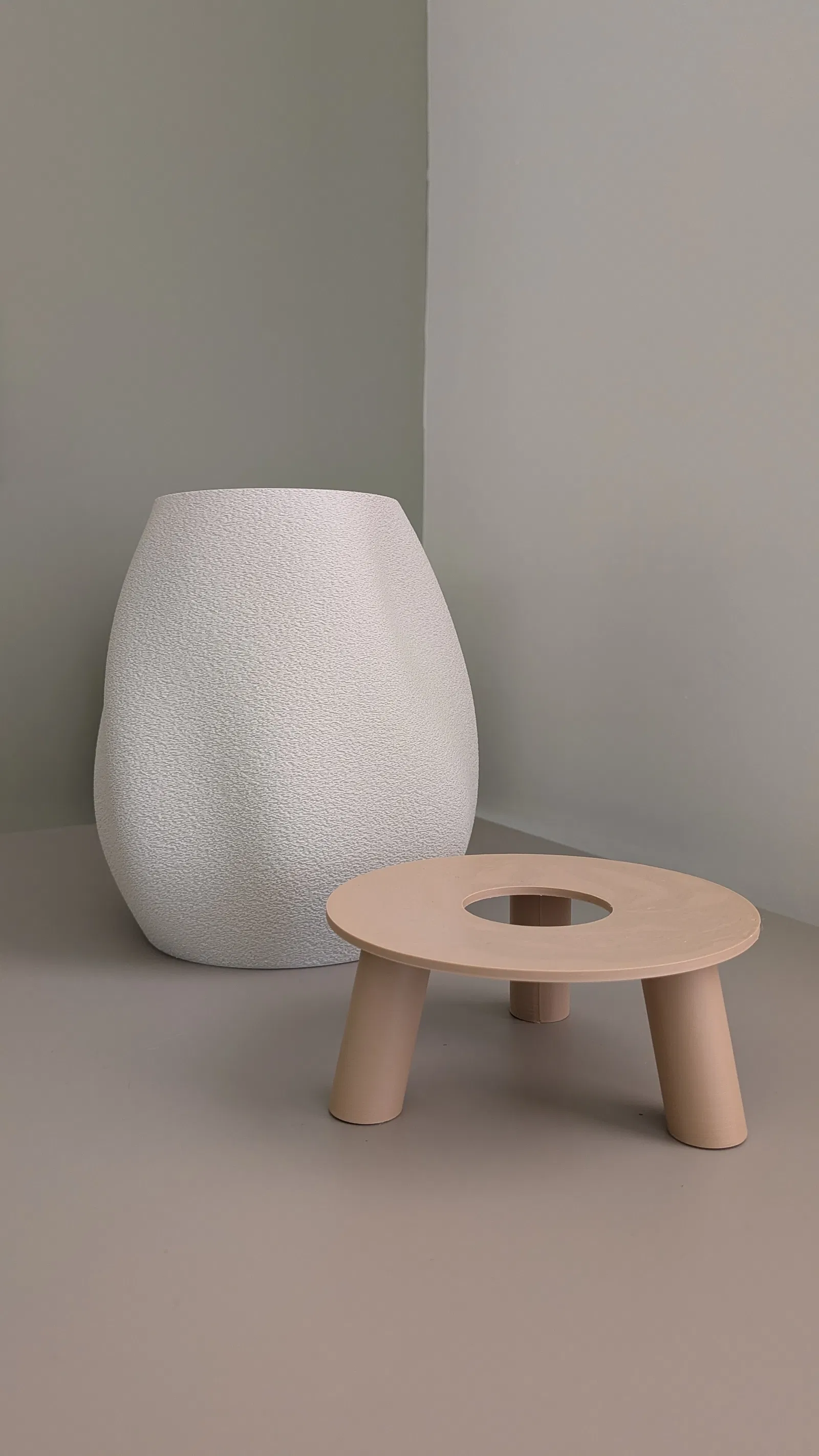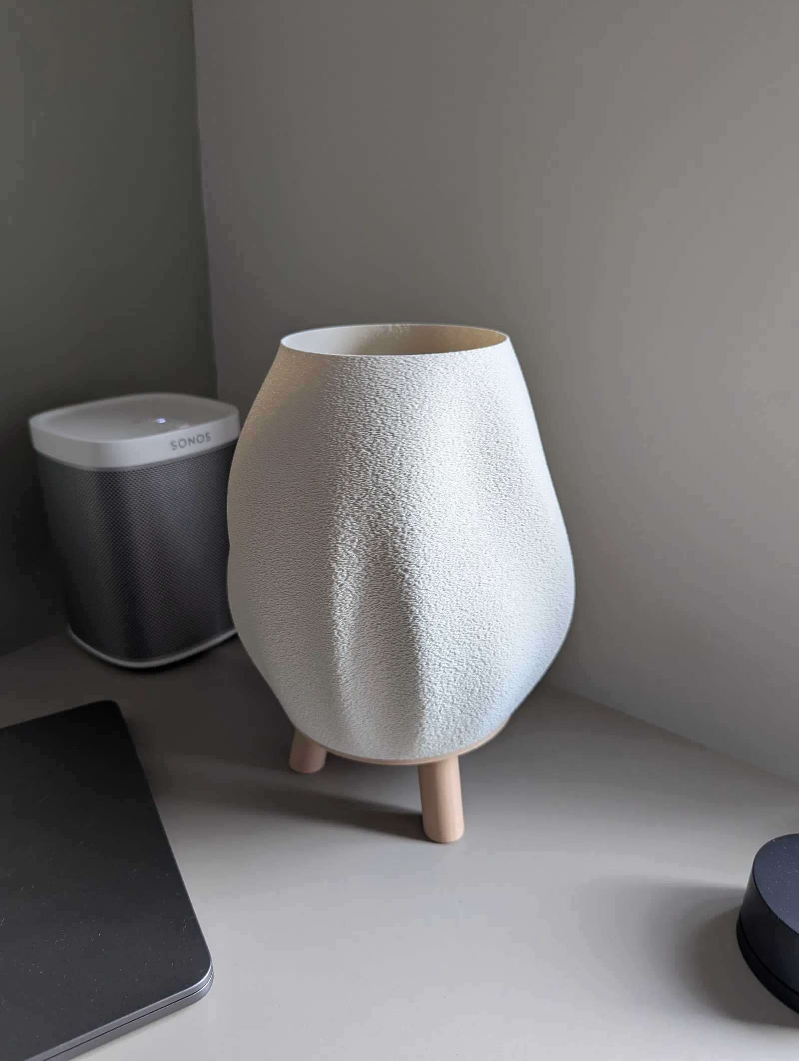 Mẫu đèn phong cách organic với chụp dáng trứng bề mặt vân sần và chân tripod chắc chắn. In PLA (fuzzy-skin) cho hiệu ứng lì đẹp mắt, tương thích đui bóng E14, hợp bàn làm việc, kệ và tủ đầu giường.