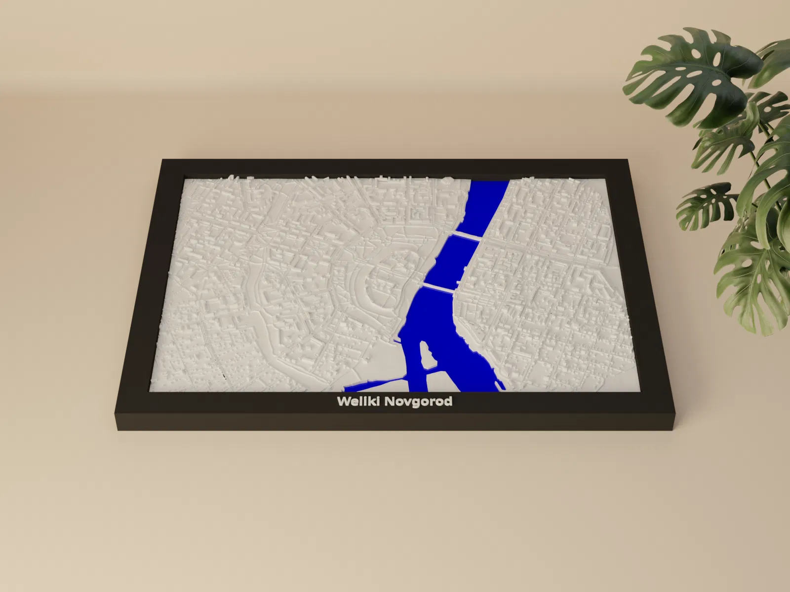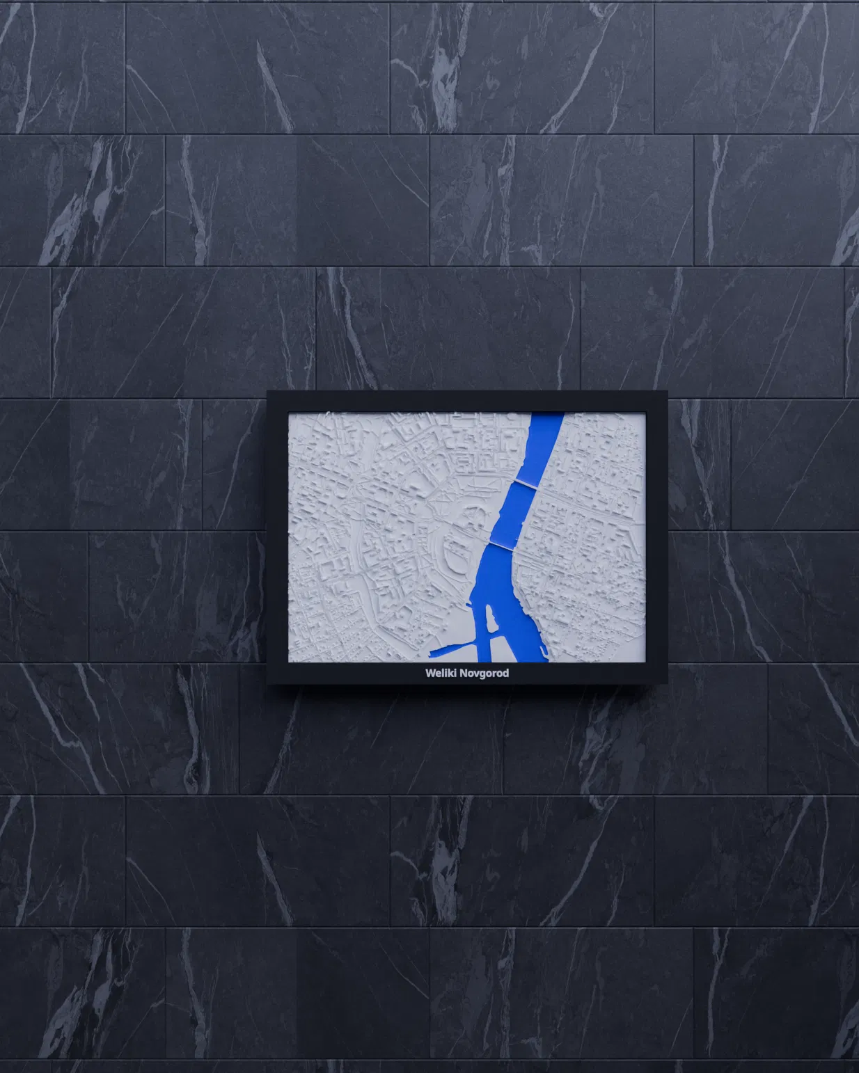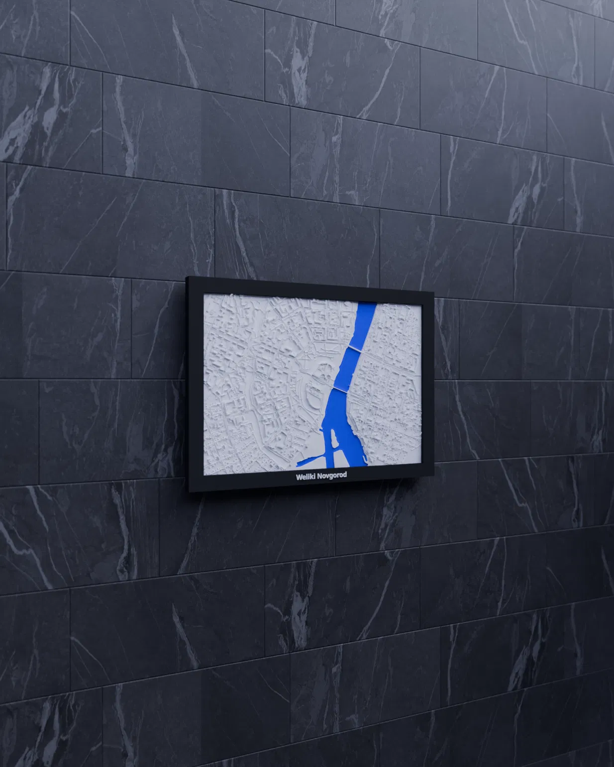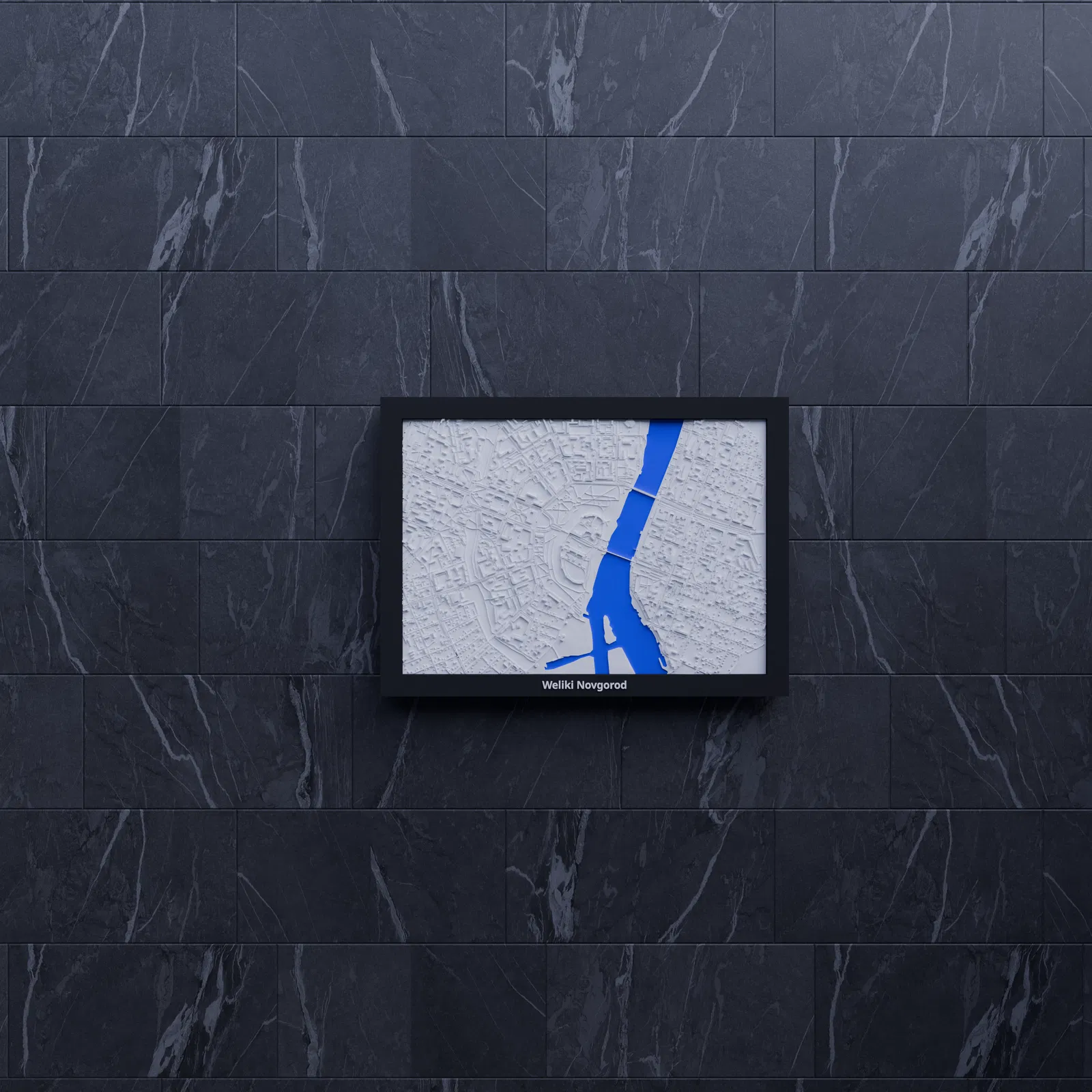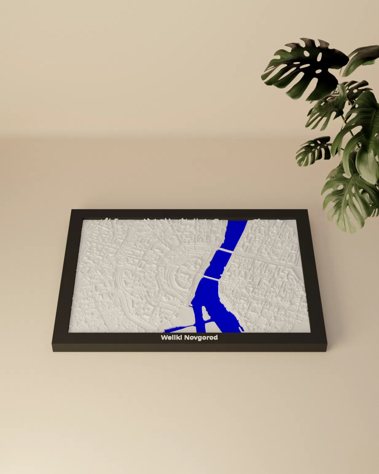 Bản thu nhỏ địa hình 3D của Weliki Novgorod (Nga), dựng từ dữ liệu địa lý quanh tọa độ 58.521, 31.276. Kích thước 170.5×119.5 mm, tỷ lệ ~16544:1, kèm nhiều frame có/không khắc chữ và lỗ treo.