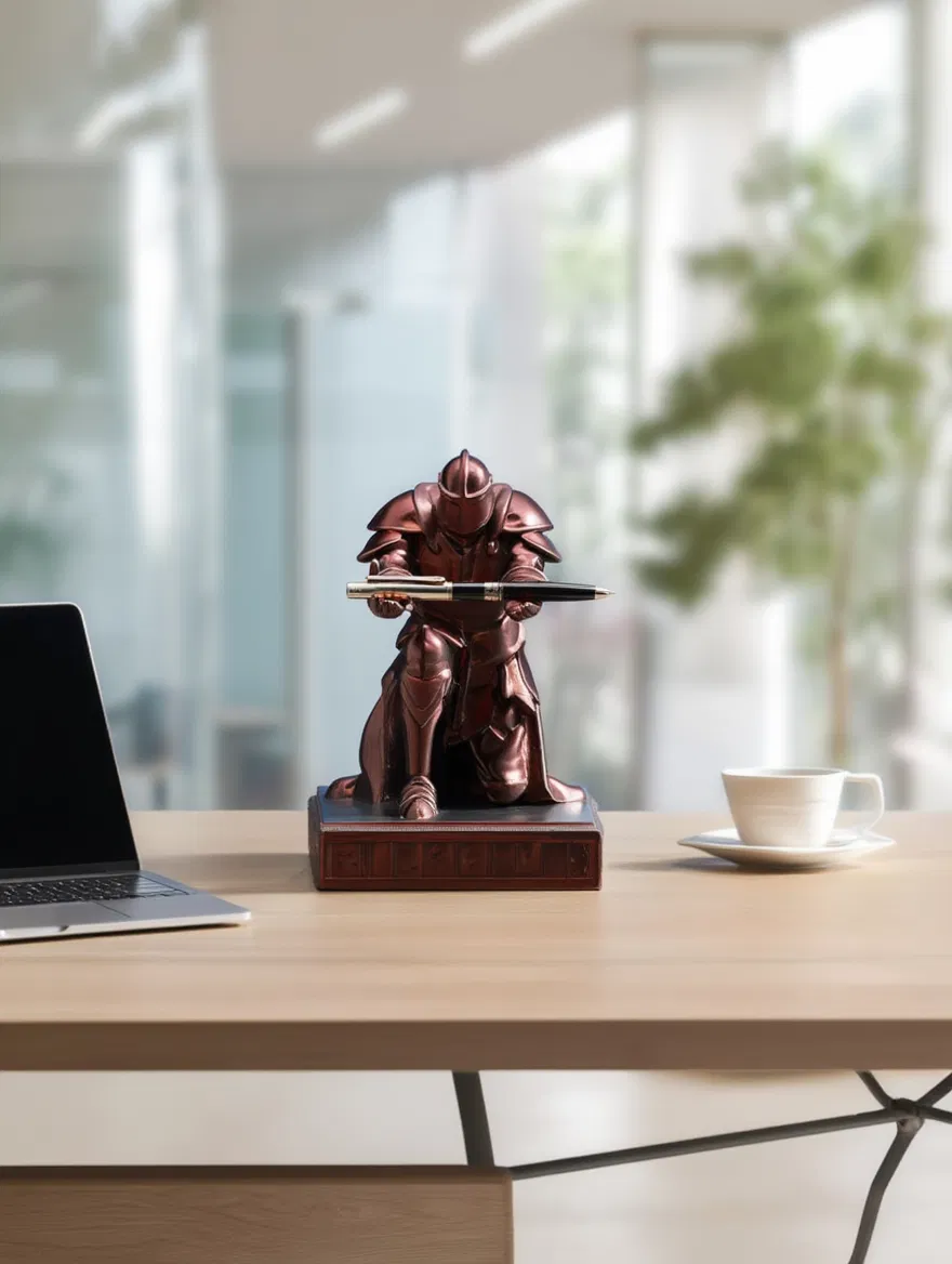 Hiệp sĩ giáp sắt quỳ gối trang nghiêm như bước ra từ biên niên sử trung cổ, hai tay kính cẩn dâng chiếc bút của bạn. Vừa là giá đỡ bút, vừa là “người gác” đầy khí chất cho góc bàn làm việc.