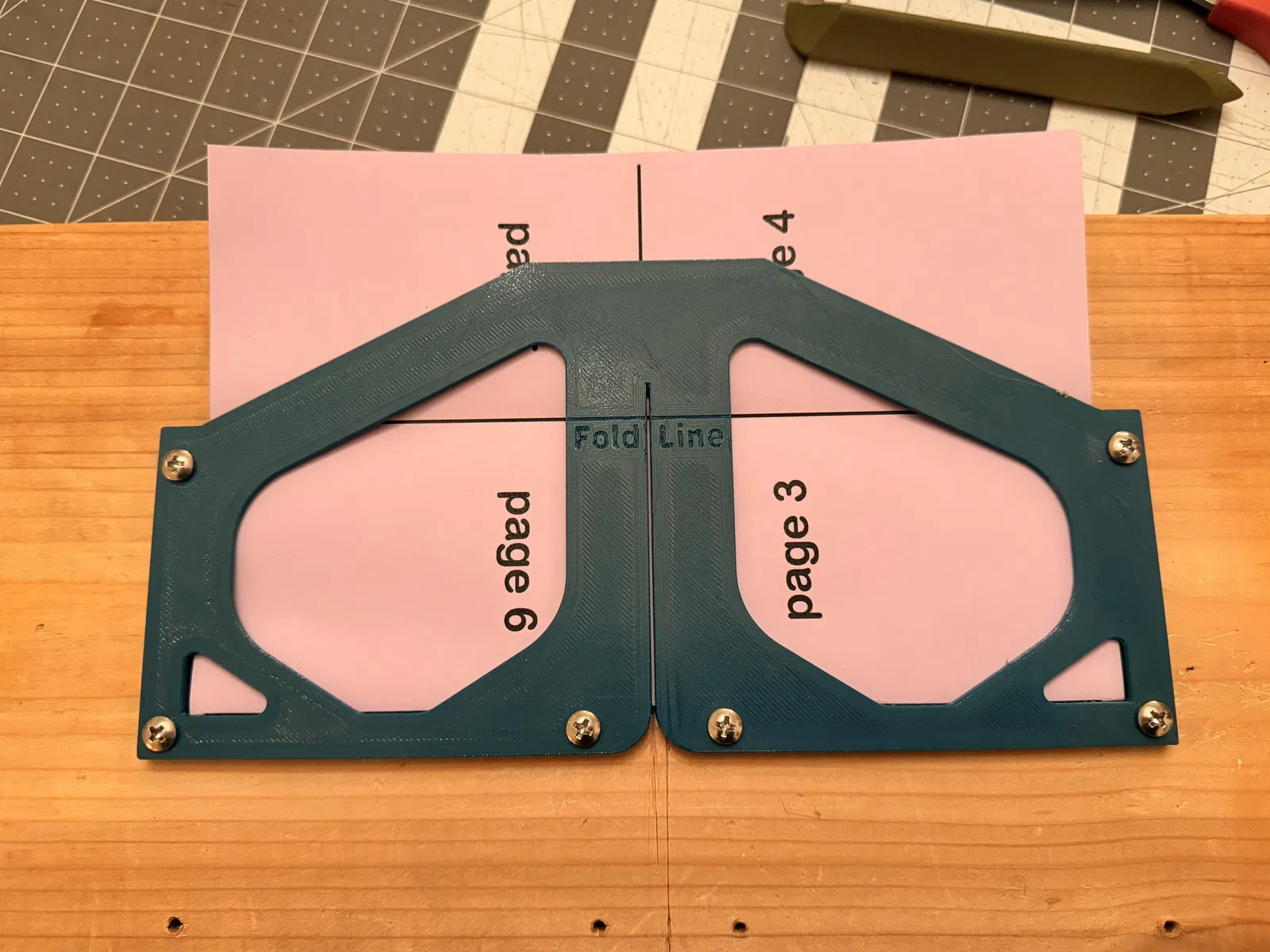 Cái guide này, khi bắt vít cố định xuống thớt cắt (cutting board) hoặc bề mặt cứng tương tự, sẽ hoạt động như một khuôn dẫn để cắt nhanh nhiều zine 8 trang. Xem hướng dẫn ở đây để gấp kiểu zine này (không liên quan/không liên kết với trang đó).