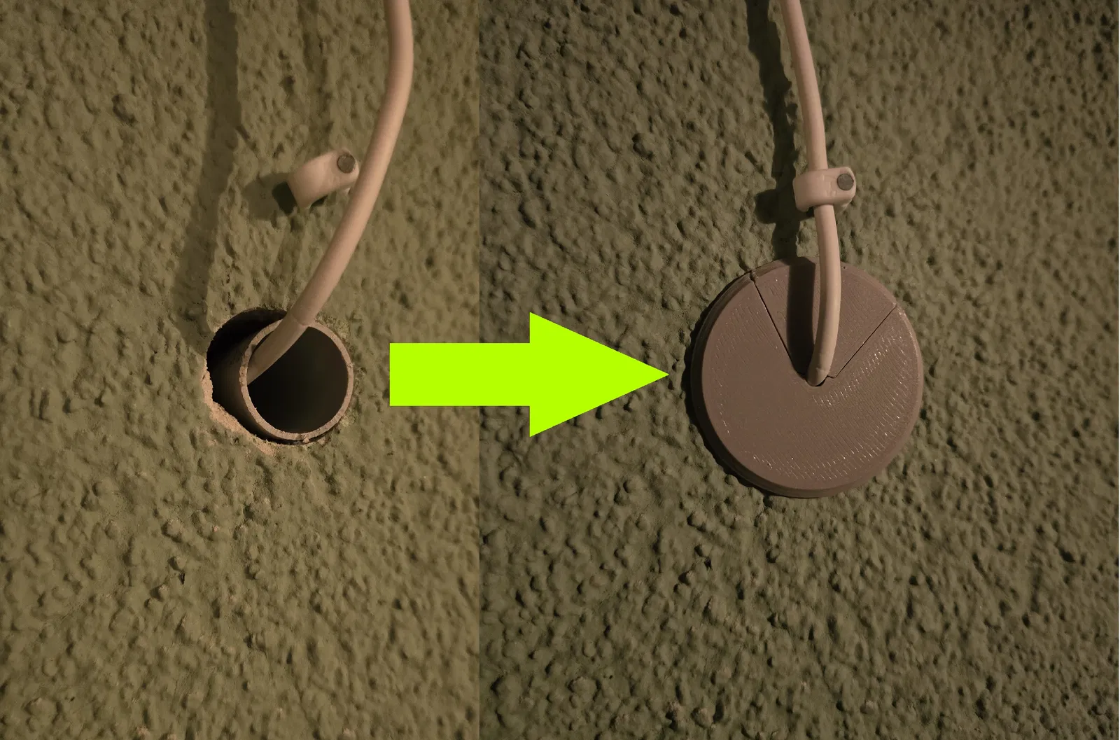 Nắp chụp cho ống luồn dây điện tiêu chuẩn Ø ngoài 20mm, thiết kế để kẹp và giữ sợi cáp 5mm đã luồn sẵn. Khi in, đặt 2 phần cách nhau một khe nhỏ; sau đó ráp lại và ấn vào trong ống.