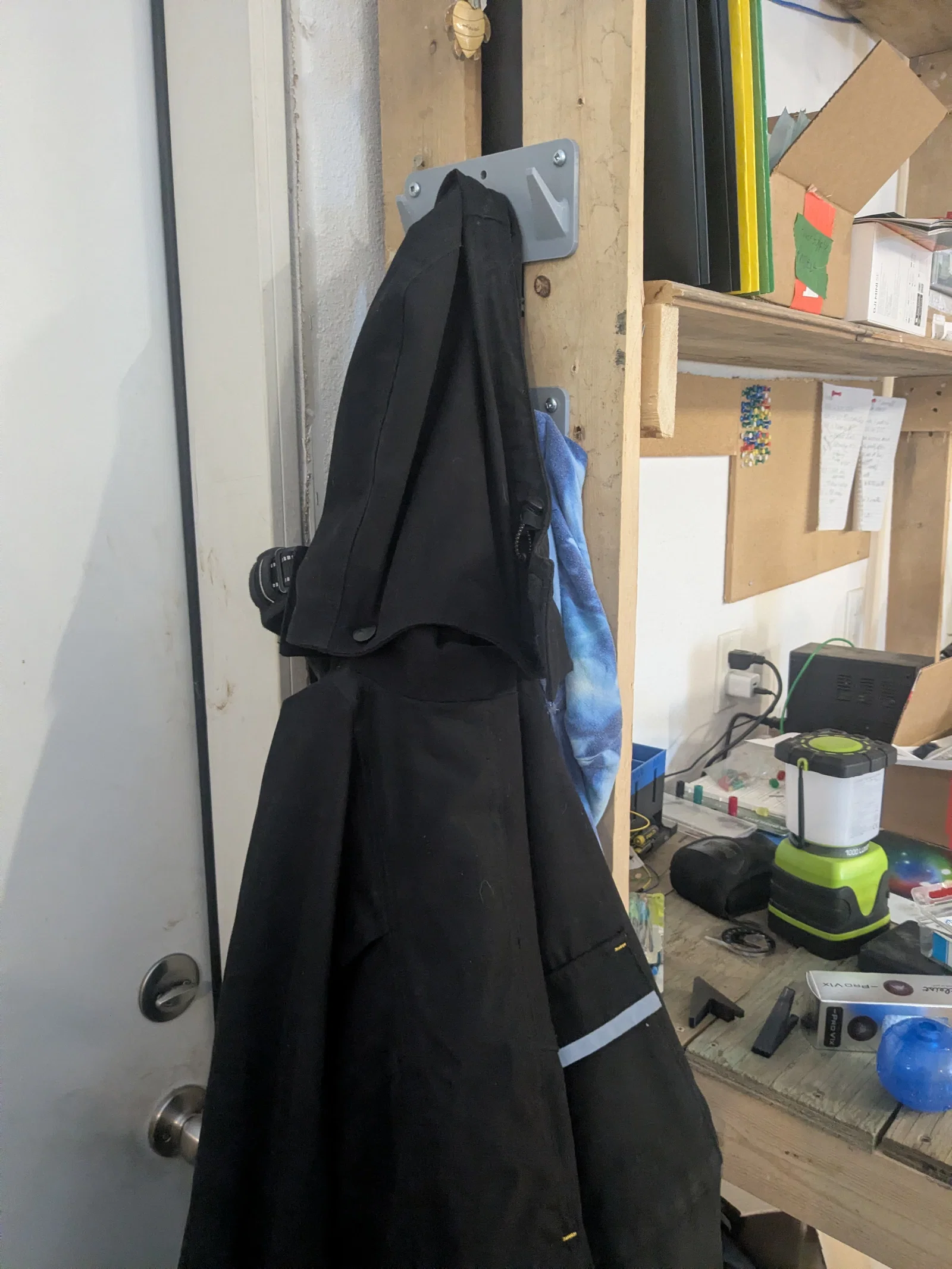 Một cái móc treo áo đơn giản mình làm riêng để bắt cố định lên bàn làm việc, ngay cạnh cửa đi bộ dẫn vào garage của mình.