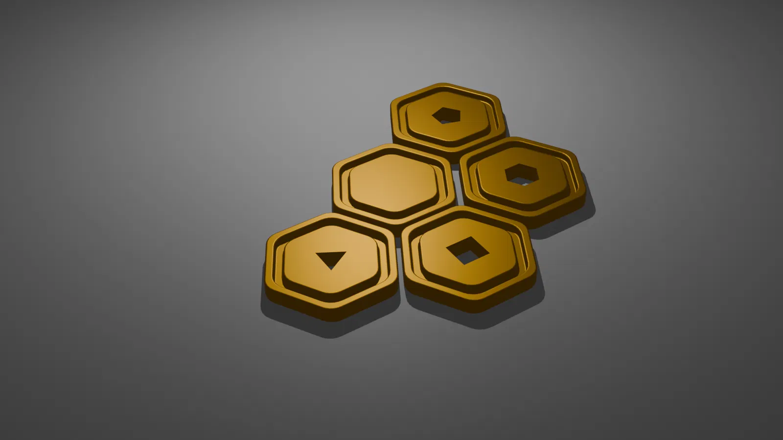 Mẫu Remix Robux có lỗ rỗng bên trong theo hình tam giác, ngũ giác hoặc lục giác, thiết kế hai mặt (double sided). Phù hợp để in 3D làm token/trang trí và thử nghiệm các kiểu lỗ khác nhau.
