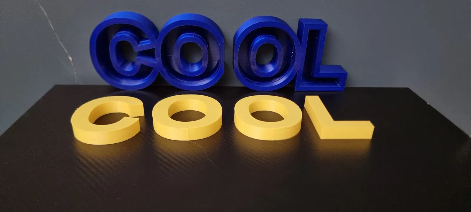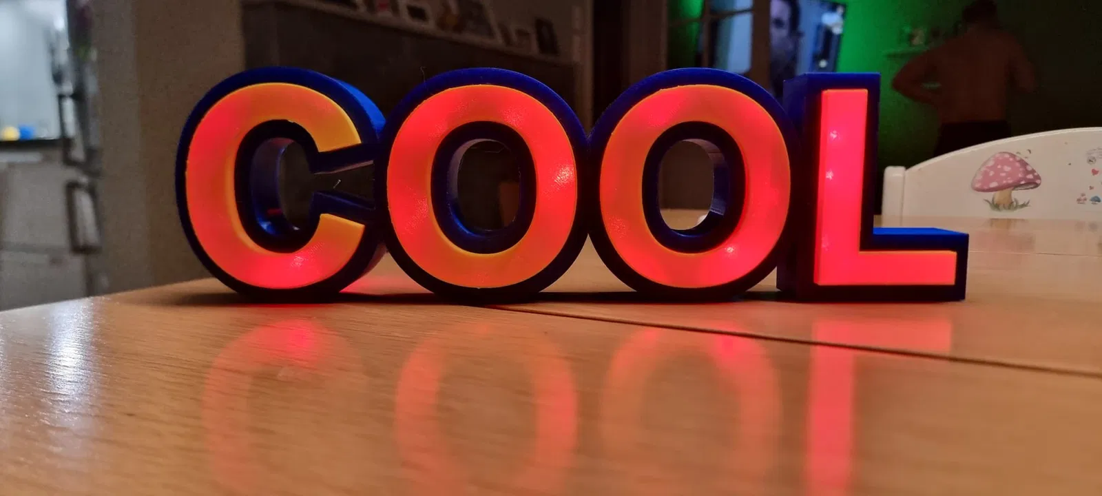 Mẫu COOL led light box với chữ “COOL” font sans-serif bo tròn, vỏ xanh cobalt đậm và mặt nạ trong suốt giúp tán sáng đều, hạn chế “hot spot”. File in gồm STL phần đế gộp và 4 nắp chữ; in xong gắn LED strips rồi lắp nắp.
