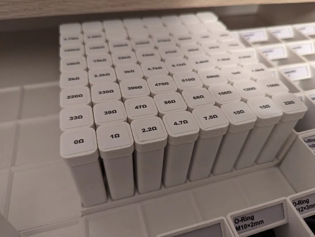 Khay và ống lưu trữ điện trở through-hole siêu tiết kiệm filament. Ống cao 64 mm vừa ngăn kéo IKEA Alex, mỗi ống (kèm nắp) chỉ ~3g filament. Có STL nhiều cỡ, tùy biến bằng OpenSCAD; in line width 0.6mm.