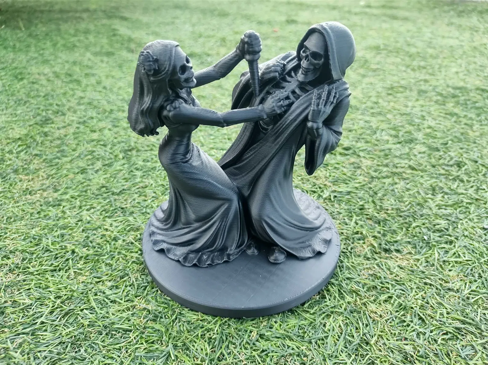 Thuộc series Eternal Embrace: một cặp đôi bộ xương đứng tạo dáng đầy kịch tính, vừa căng thẳng mà vẫn lãng mạn. Áo choàng bay bồng, tiếp xúc sát gần, kèm màn “nhảy” dao găm tinh nghịch làm câu chuyện gothic thêm cuốn. Rất hợp để làm đồ trang trí dark romance, quà tình yêu hơi rùng rợn, hoặc món trưng bày cho bộ sưu tập fantasy / macabre.