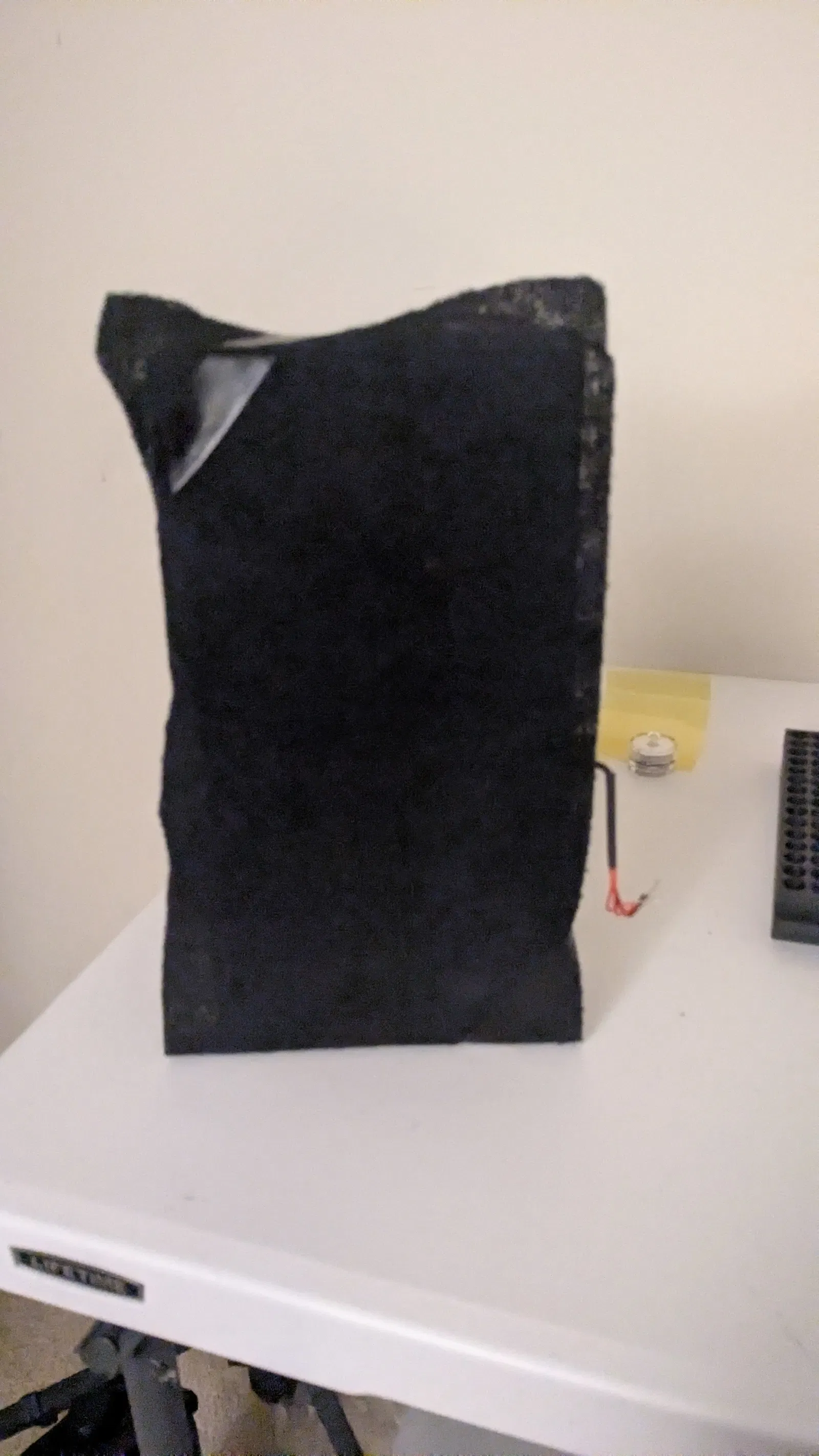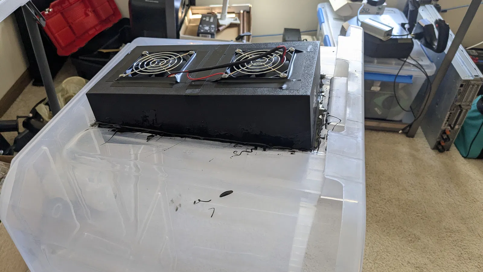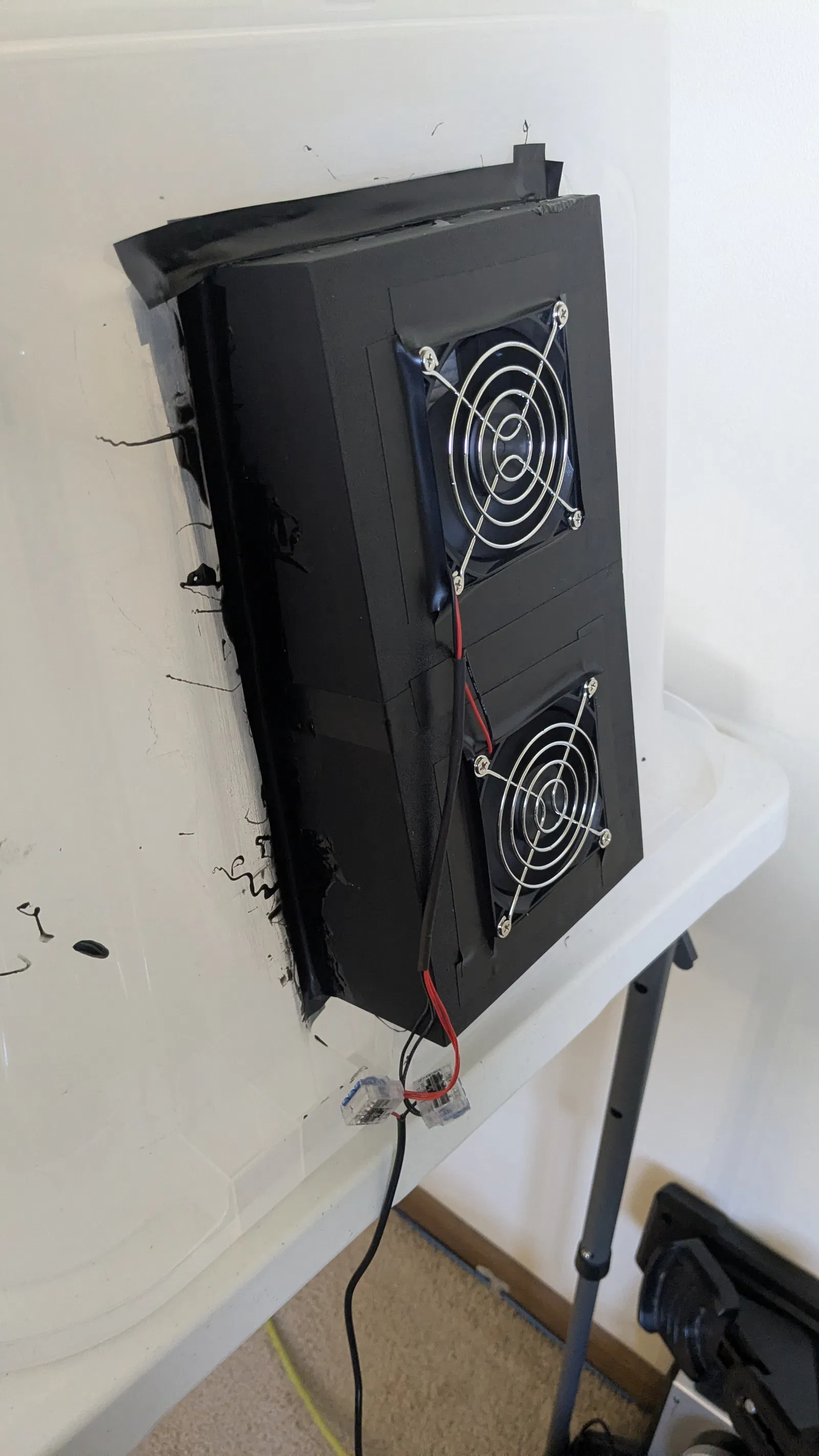 Mình có phải cắt mẫu ra làm 2 phần bằng slicer rồi dán lại với nhau. Sau đó để bịt kín mọi chỗ hở, mình dùng băng keo điện nhằm đảm bảo không khí chỉ bị hút vào qua quạt, và giảm lượng khí lọt/thoát ra quanh phần vỏ.
