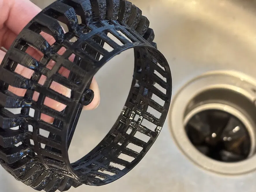 Rổ lọc cho lỗ thoát bồn rửa bếp 85–90mm, giúp chặn dao muỗng và cả trang sức khỏi rớt xuống cống hoặc food waste disposer. Nhấc lên bằng lift bar, xả nước cho rác trôi; hợp PETG, có thể rửa máy nếu dùng filament chịu nhiệt.