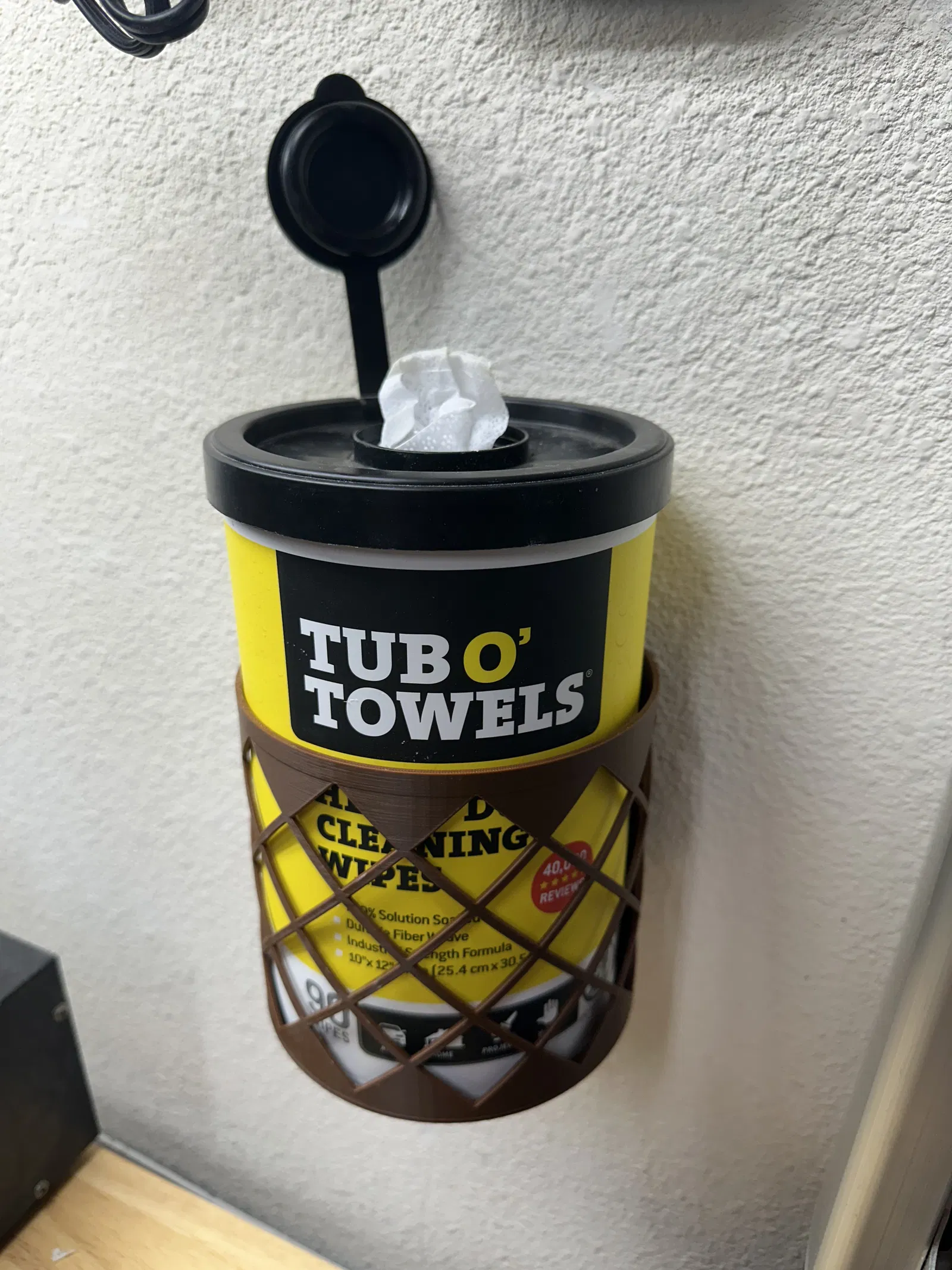 Giá treo tường cho lon khăn lau vệ sinh loại heavy duty, giúp giải phóng mặt bàn trong garage/xưởng và lấy khăn nhanh, tiện. In được với PLA/PLA+, không cần support; tăng walls để hông chắc mà không cần infill.