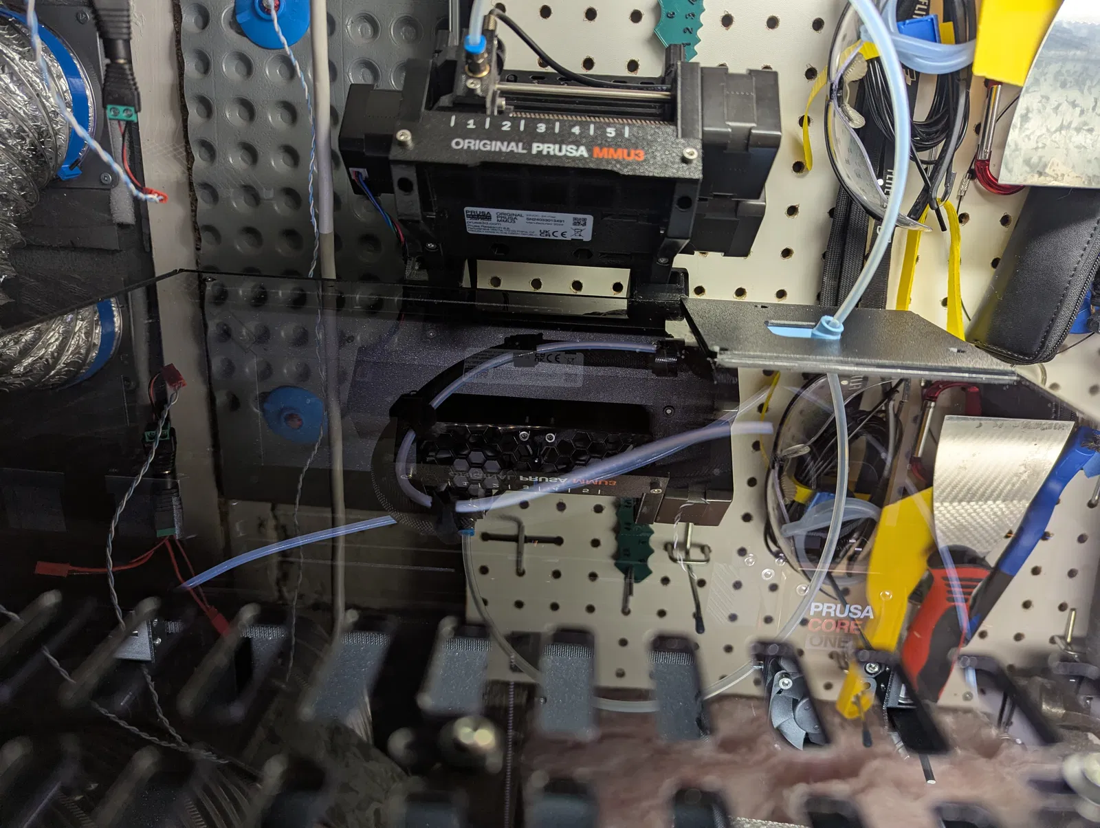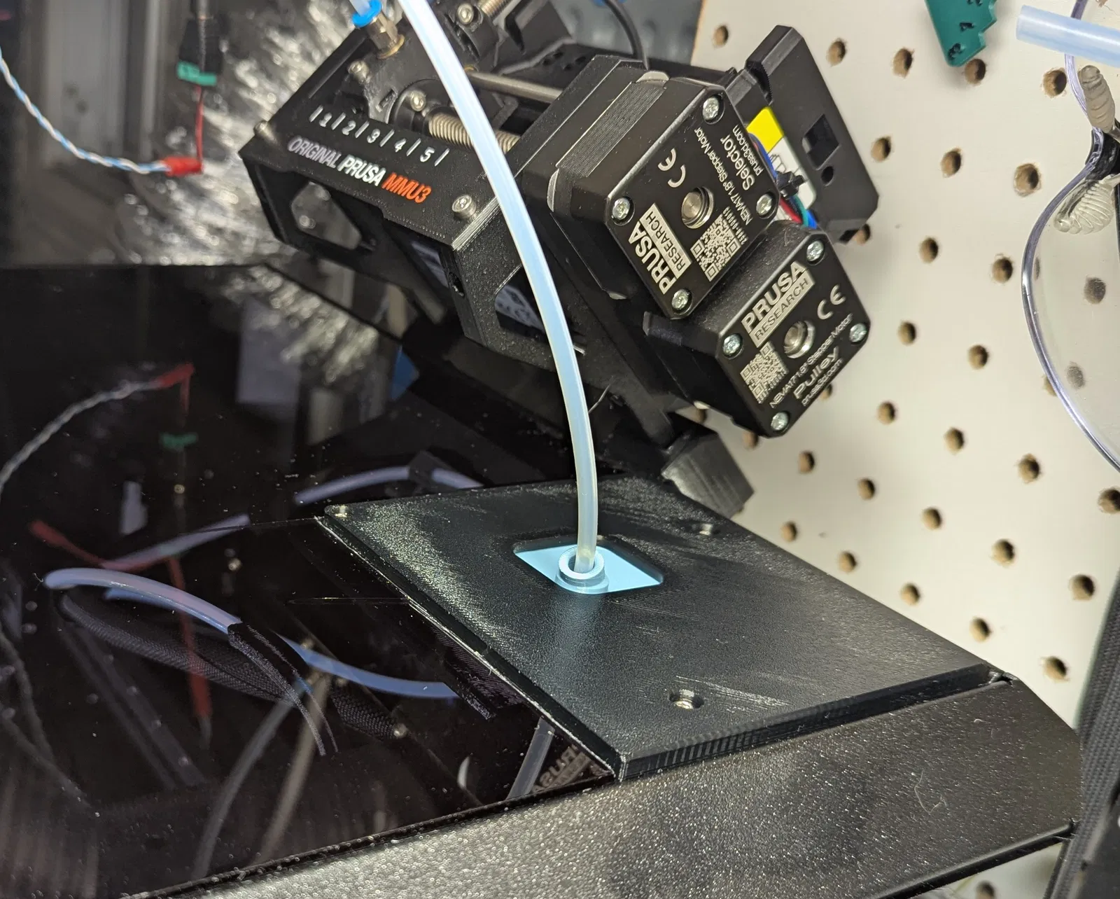 Đây là một bản remix của mẫu MMU3 top guide rất phổ biến. Điểm khác biệt chính là phần gờ (lip) của tấm top plate được cắt gọn để nắp PC có thể hạ xuống và nhấc lên để thao tác nhanh hơn, thay vì phải trượt vào rãnh (channel) có sẵn. Mọi thứ nằm phẳng (flush) trên mặt trên nên chuyện nhiệt thoát ra ngoài chắc không thành vấn đề.