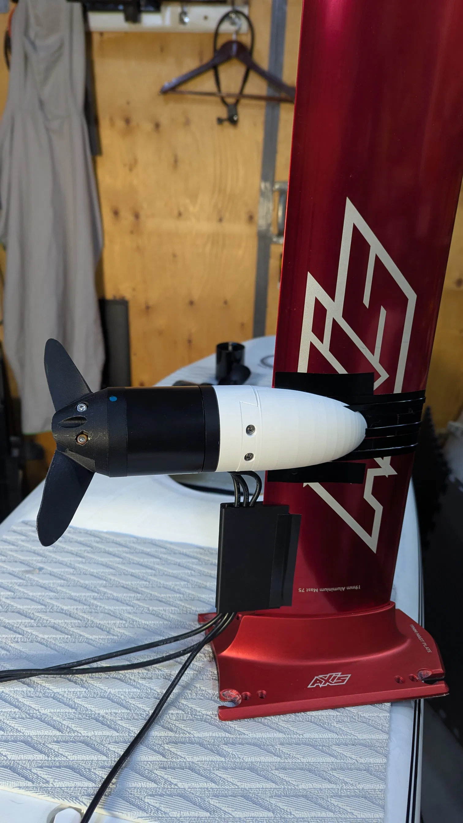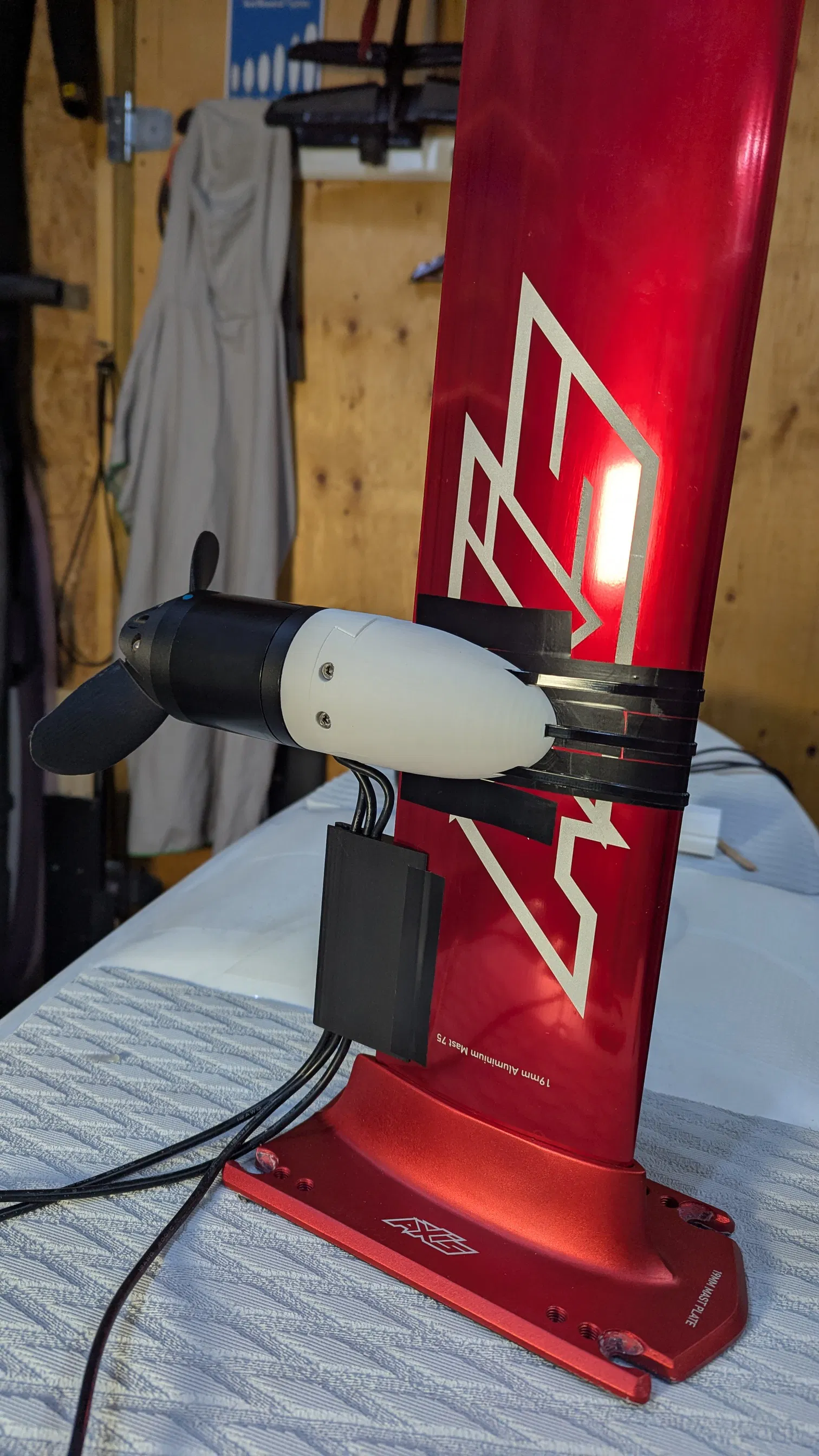 Đây là một ngàm motor tối giản (motor Flipsky 6384/6374) cho DIY foil drive / foil assist. Mình đã dựng một insert để gắn vào cây mast Axis đỏ loại 19mm. Nếu bạn muốn tự làm insert mast của riêng mình, mình có kèm một bản motor mount “blank” để bạn Boolean (subtract) theo mast foil của bạn, nhưng phần đó bạn sẽ phải tự model.