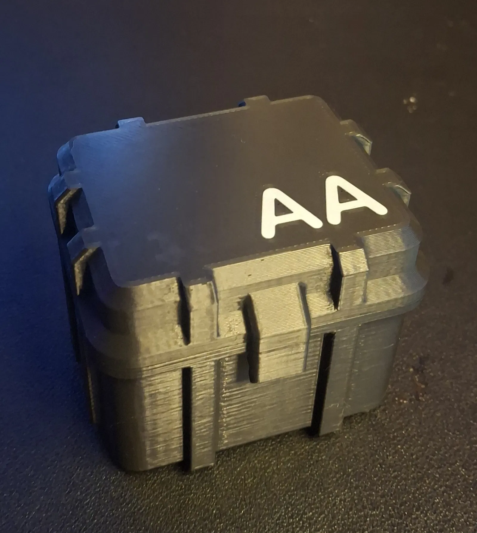 Hộp rugged in 3D không cần supports, chứa 12 pin AA (kể cả pin sạc Amazon đường kính lớn hơn). Nắp snap đóng chắc, dễ quan sát số pin còn lại và giúp khu vực sạc/lưu trữ gọn gàng.