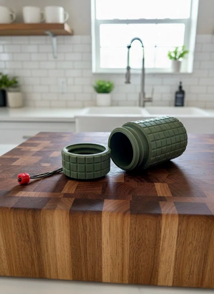 Hộp chứa dạng rugged với nắp vặn ren thô, bề mặt ngoài có texture frag pattern. Trên nắp có lỗ xỏ dây, kèm frag bead cho paracord ở plate thứ hai. Có thể scale lớn/nhỏ mà ren vẫn vặn khớp.