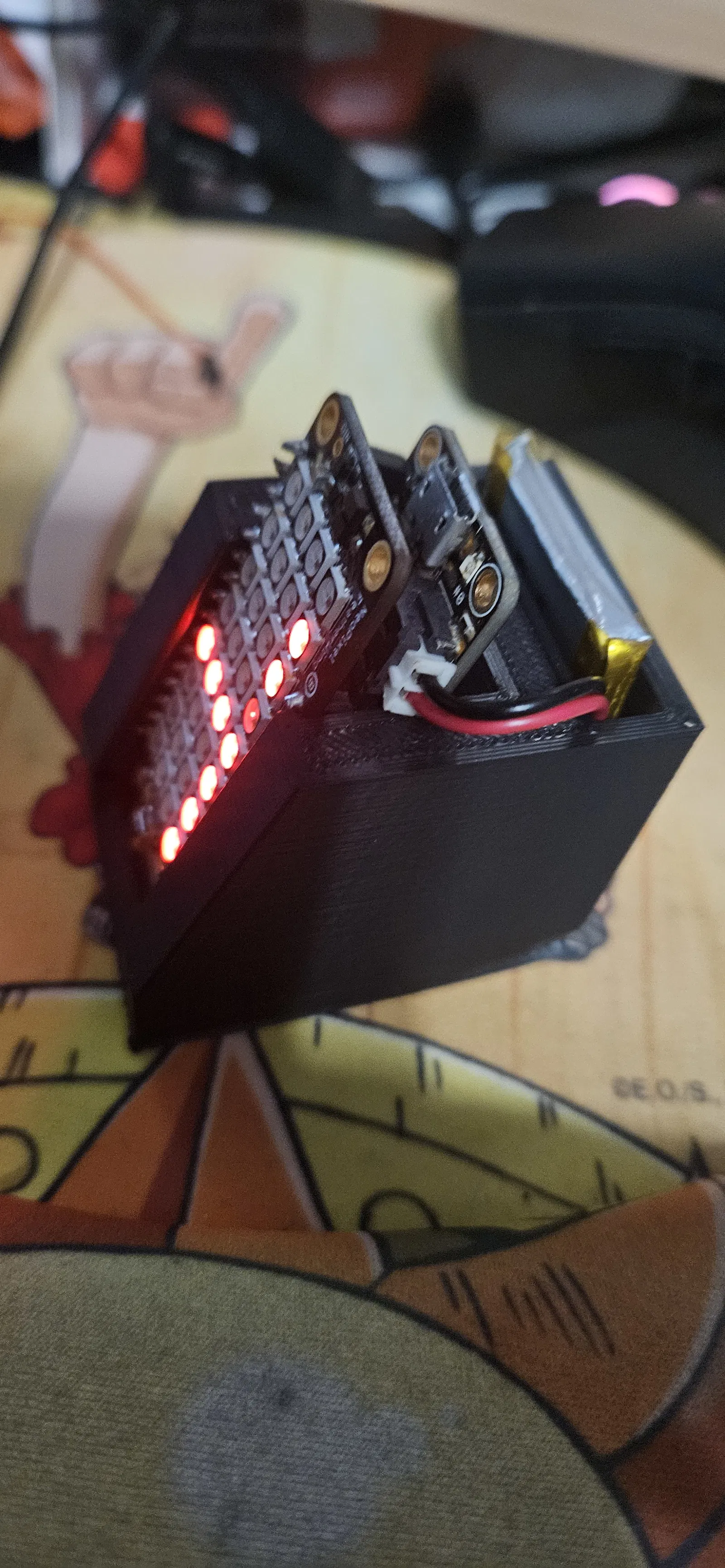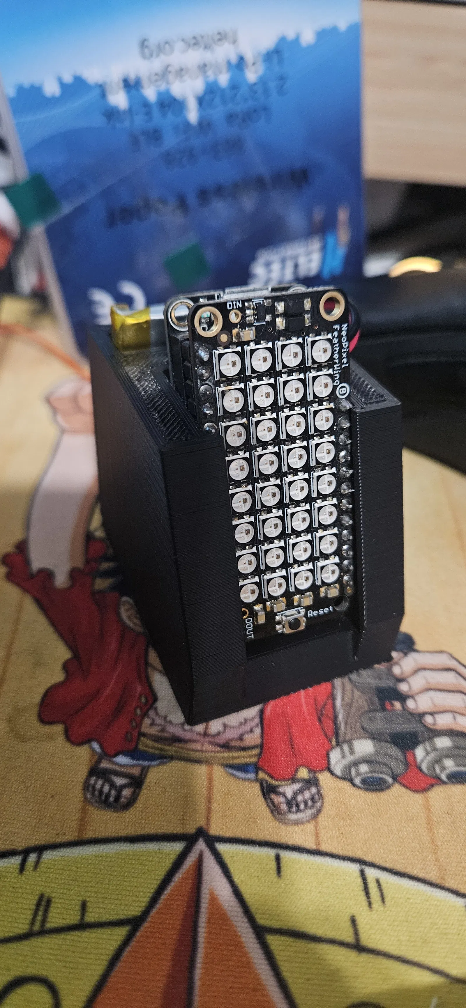 Desk stand kèm khay giữ pin cho HUZZAH Feather ESP8266 + Adafruit NeoPixel FeatherWing 4x8 (NeoMatrix). Thiết kế vừa pin PKCELL LP503035 LiPo 3.4V 500mAh, giúp bảng chữ chạy gọn gàng và dễ mang theo.