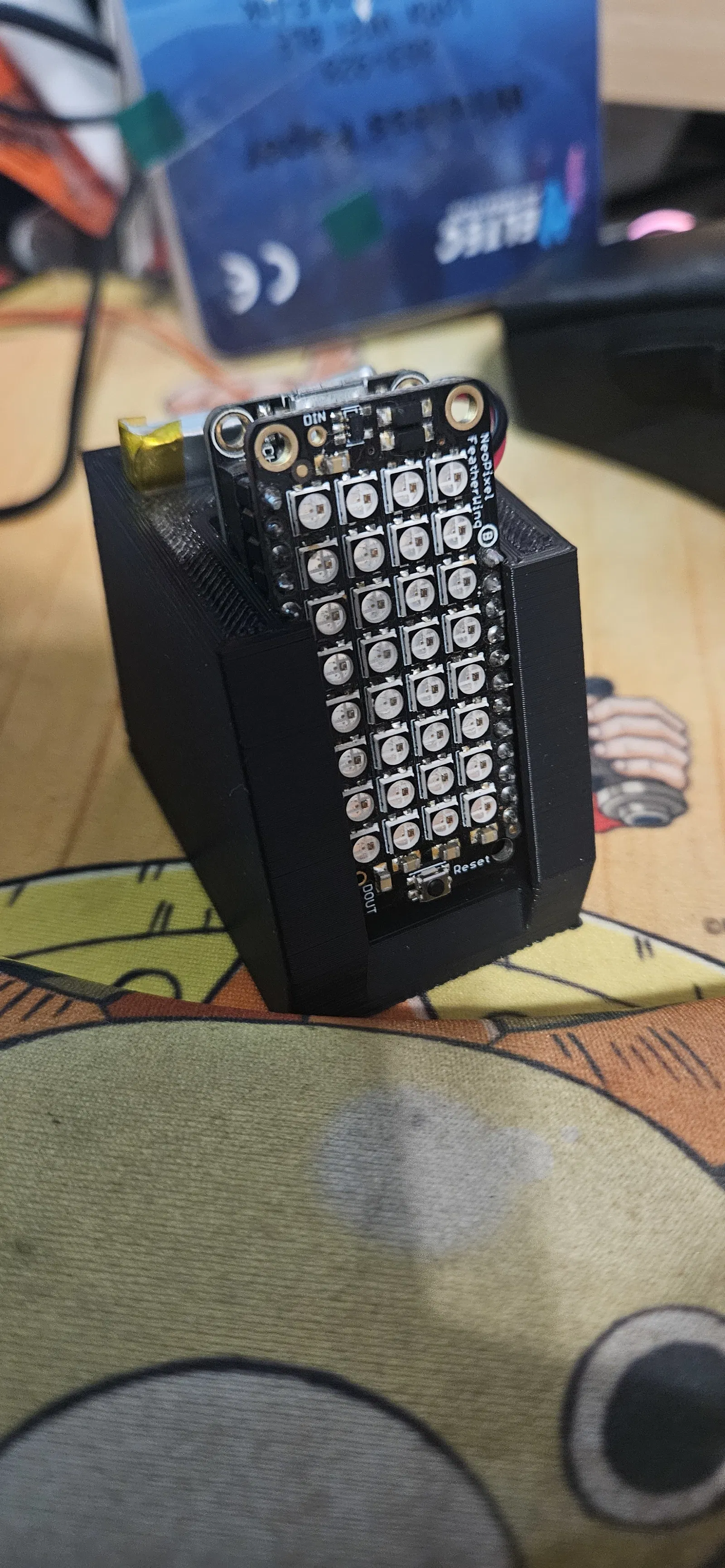 Đây là một mẫu desk stand đơn giản kèm battery holder cho bộ HUZZAH Feather ESP8266 + Adafruit NeoPixel FeatherWing 4x8 (NeoMatrix) bảng chữ chạy (scrolling text).