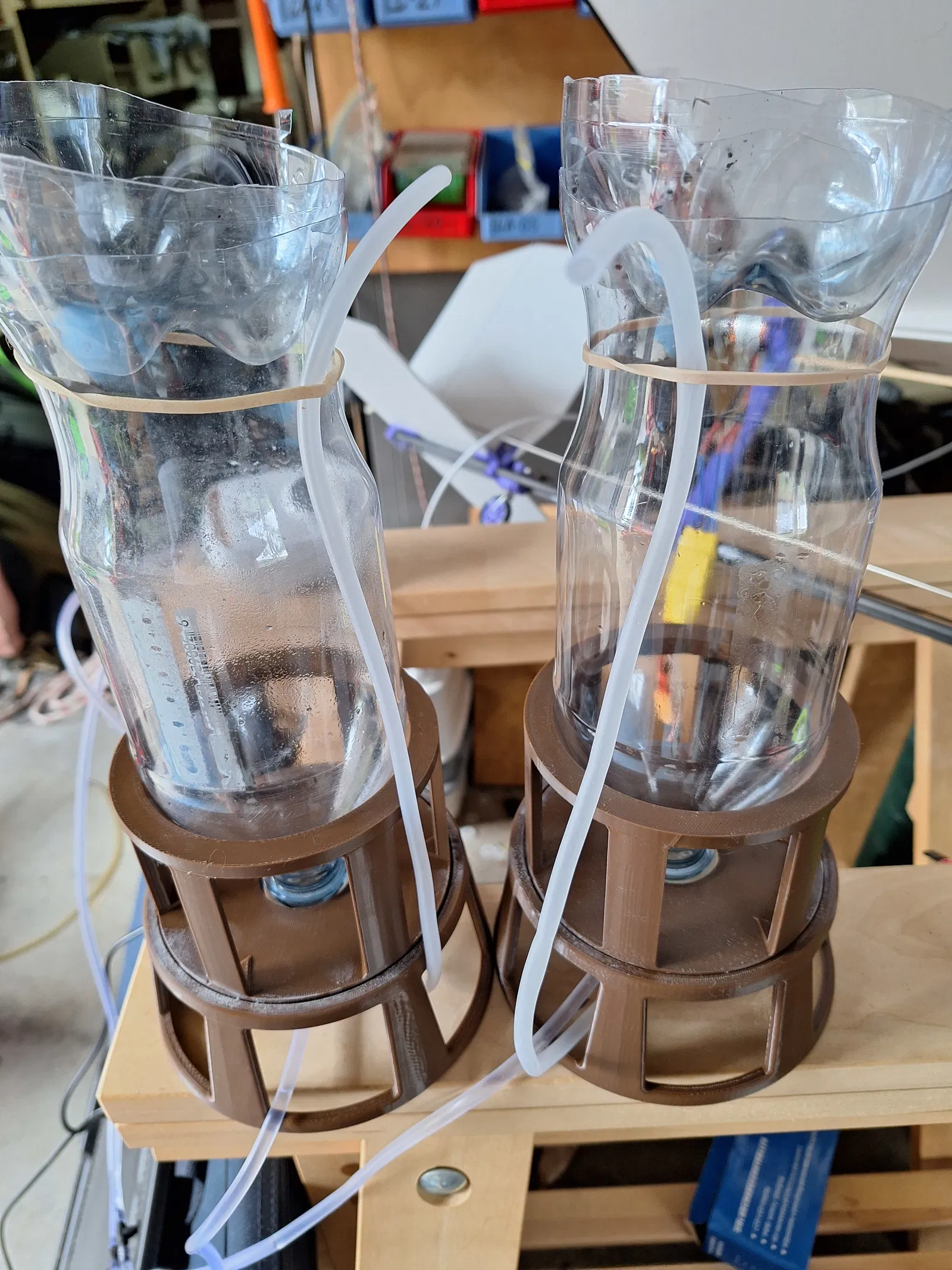 Giá đỡ chai soda cho brine shrimp gồm 2 phần để giảm hao phí support. Khuyến nghị in PETG. Thiết kế bằng Freecad, có kèm bản vẽ. Dùng nắp chai 2 cổng air line, dán lại bằng keo 502.