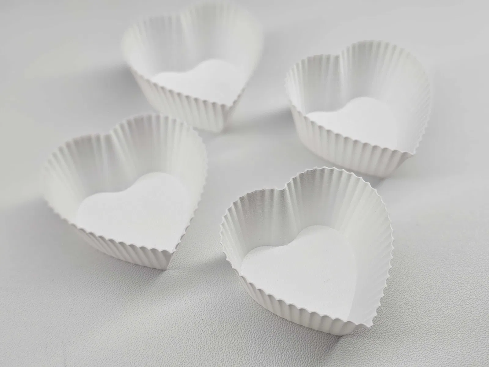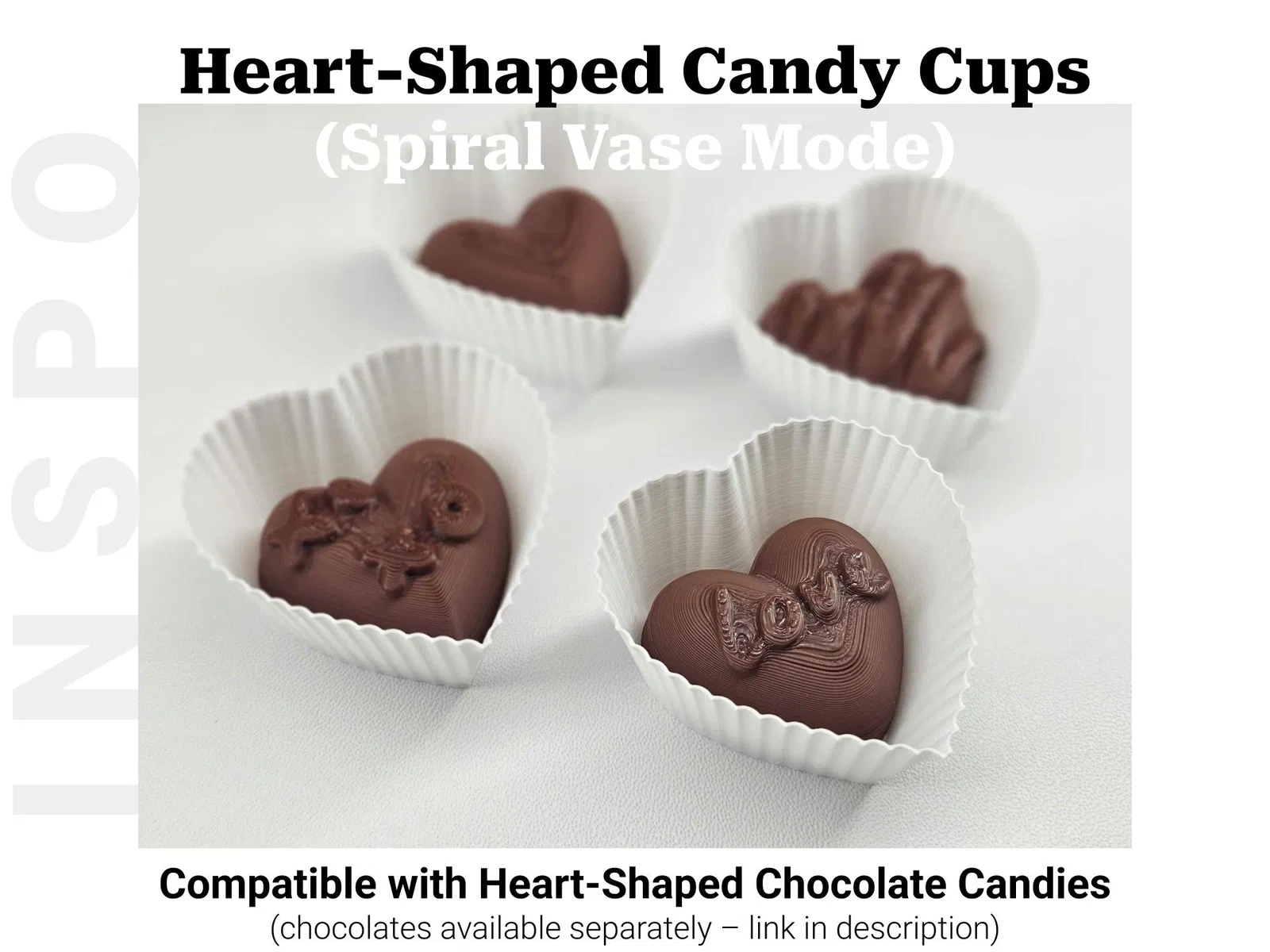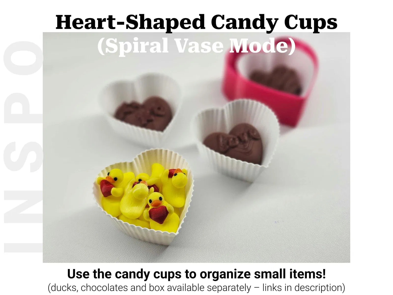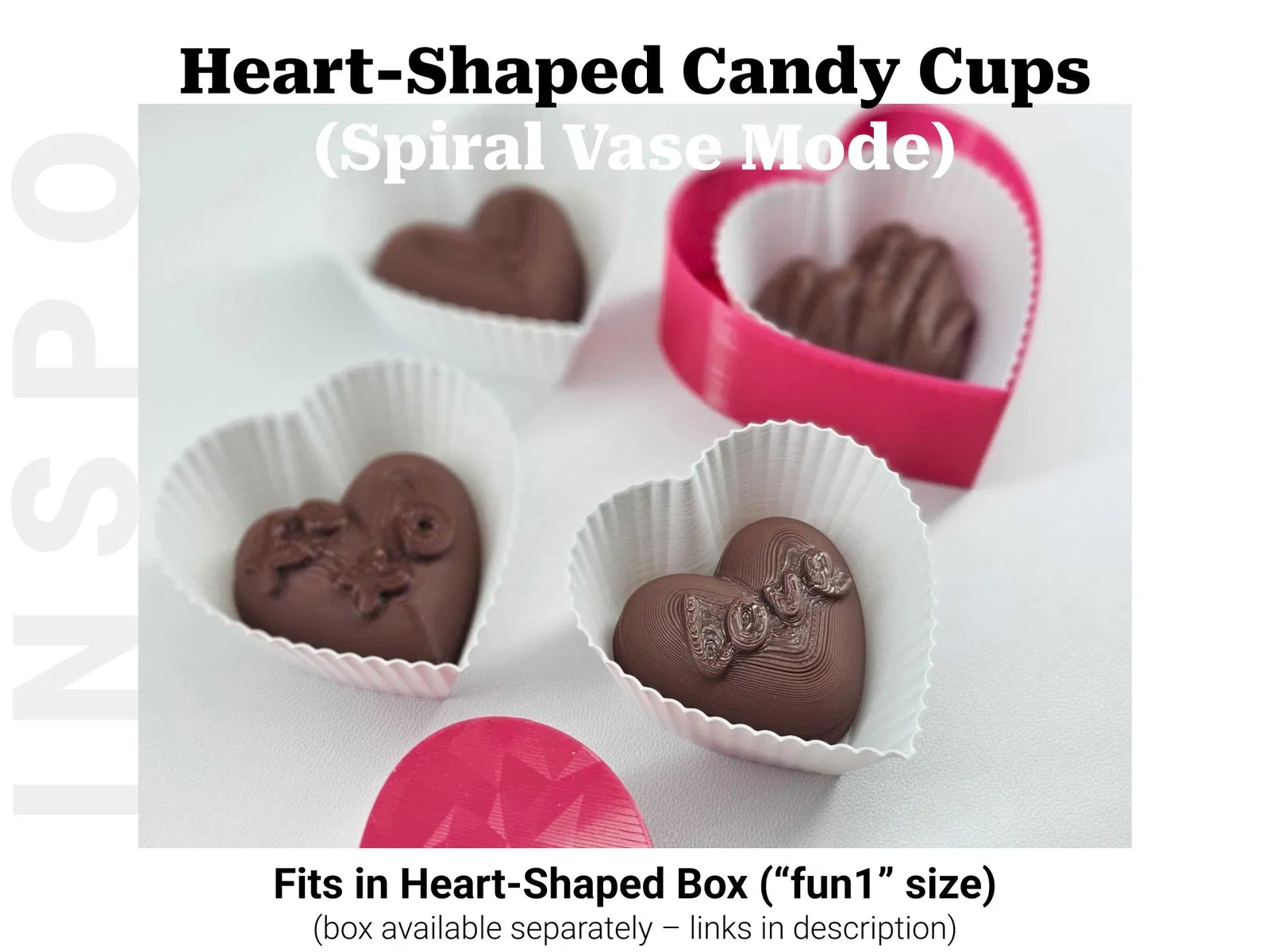 Mẫu ly/khuôn kẹo hình trái tim lấy cảm hứng từ khuôn giấy mini đựng cupcake trong hộp socola. Khuyến nghị in ở chế độ Spiral Vase Mode; tham khảo file 3MF để xem đúng các print settings.