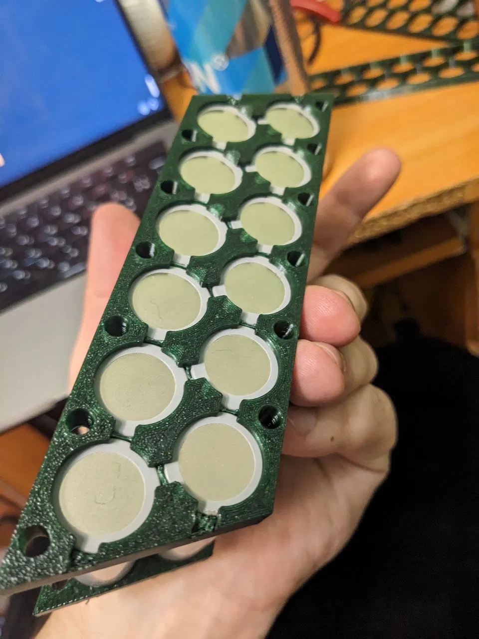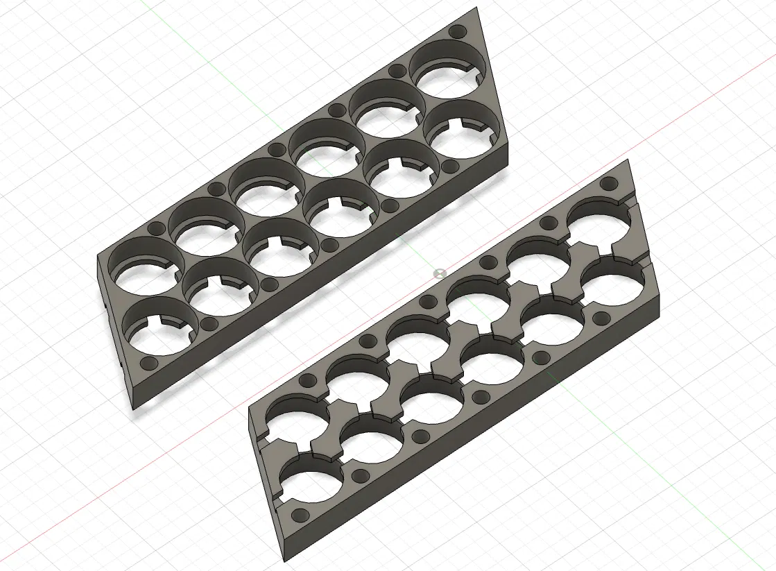 Mình cần một cái holder cho 12x pin 21700, xếp kiểu so le để bố trí gọn hơn, mà tìm hoài trên đây không thấy mẫu nào phù hợp. Nên mình quyết định tự làm một mẫu. Mình cũng thêm các khe để hàn dây (vì mình không có dụng cụ spot welding).