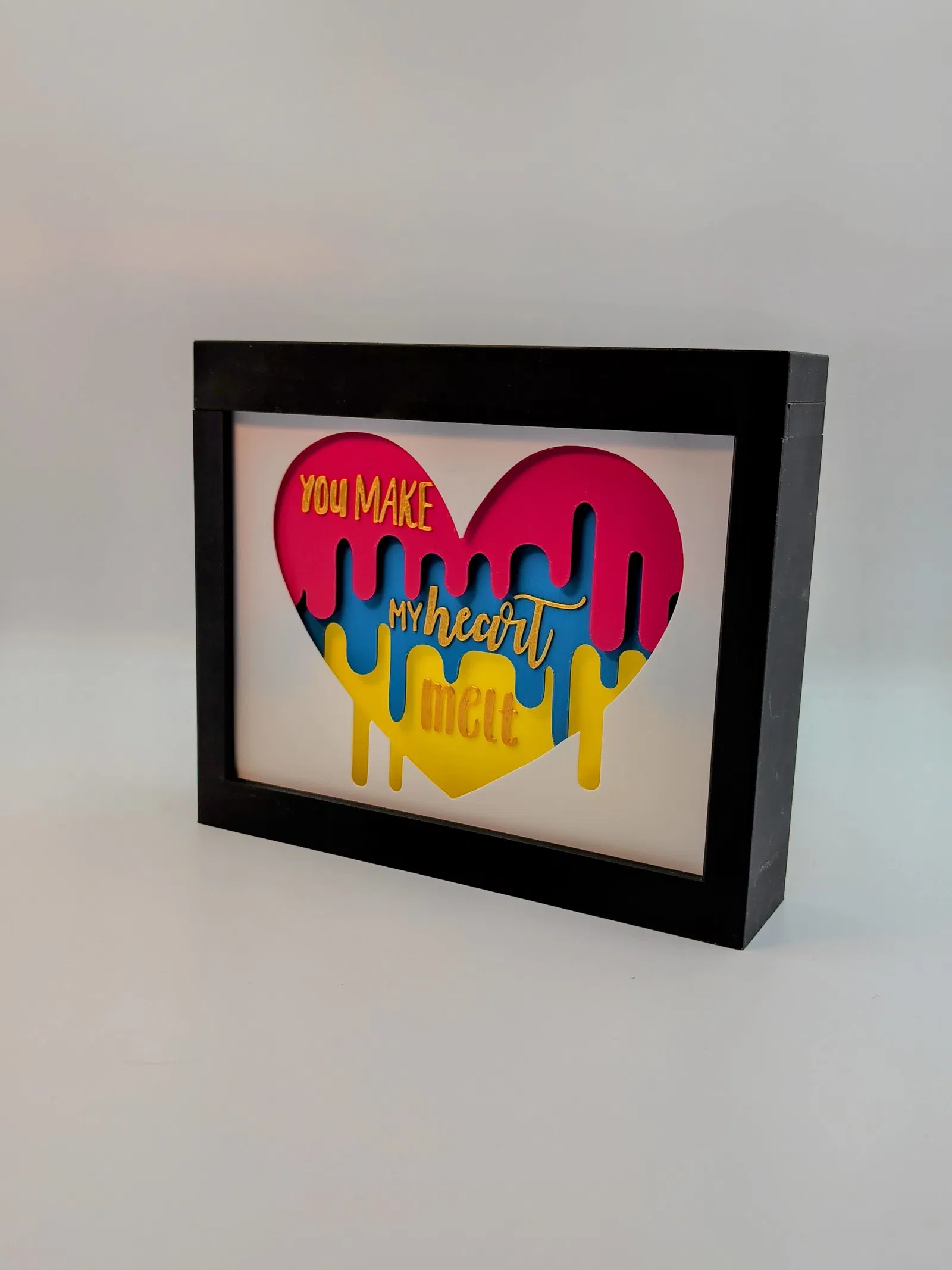 Shadow box Valentine với hình trái tim “chảy” và thông điệp dễ thương. Thiết kế dạng nhiều lớp tạo chiều sâu, chữ nổi rõ sau khi in. In đẹp với màu sáng, ưu tiên filament matte; đổi màu bằng thay filament thủ công.