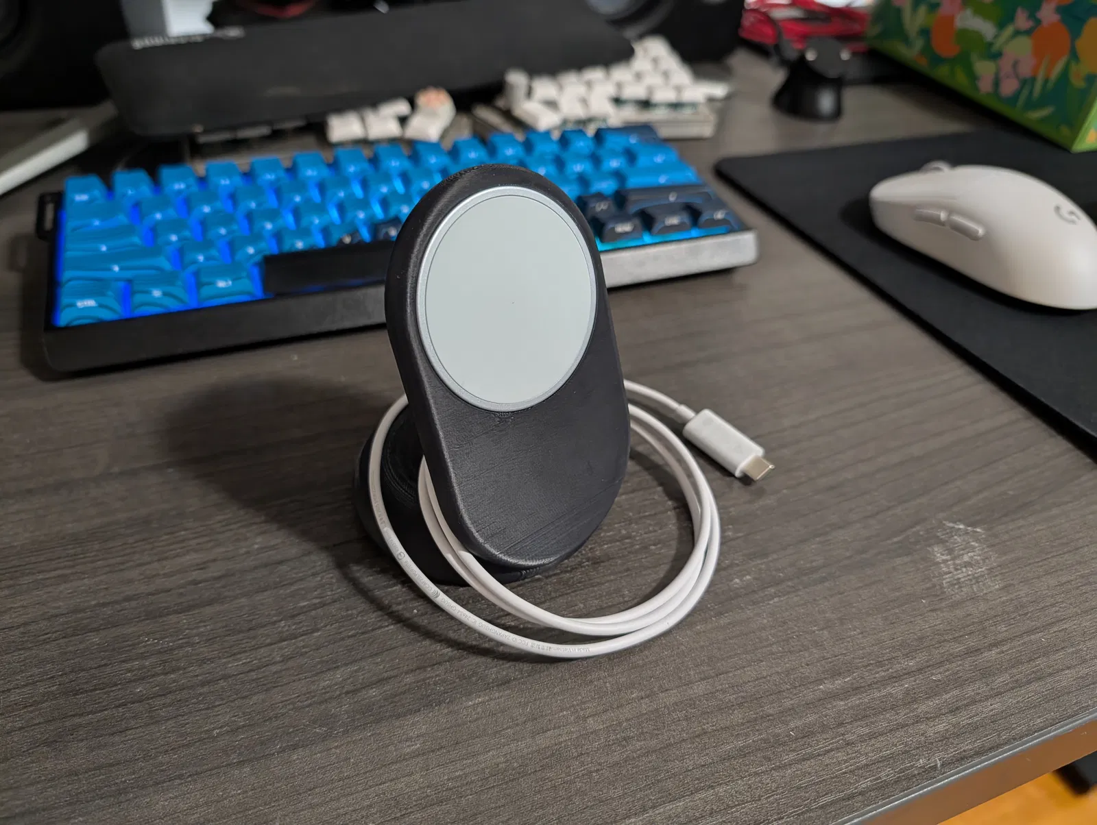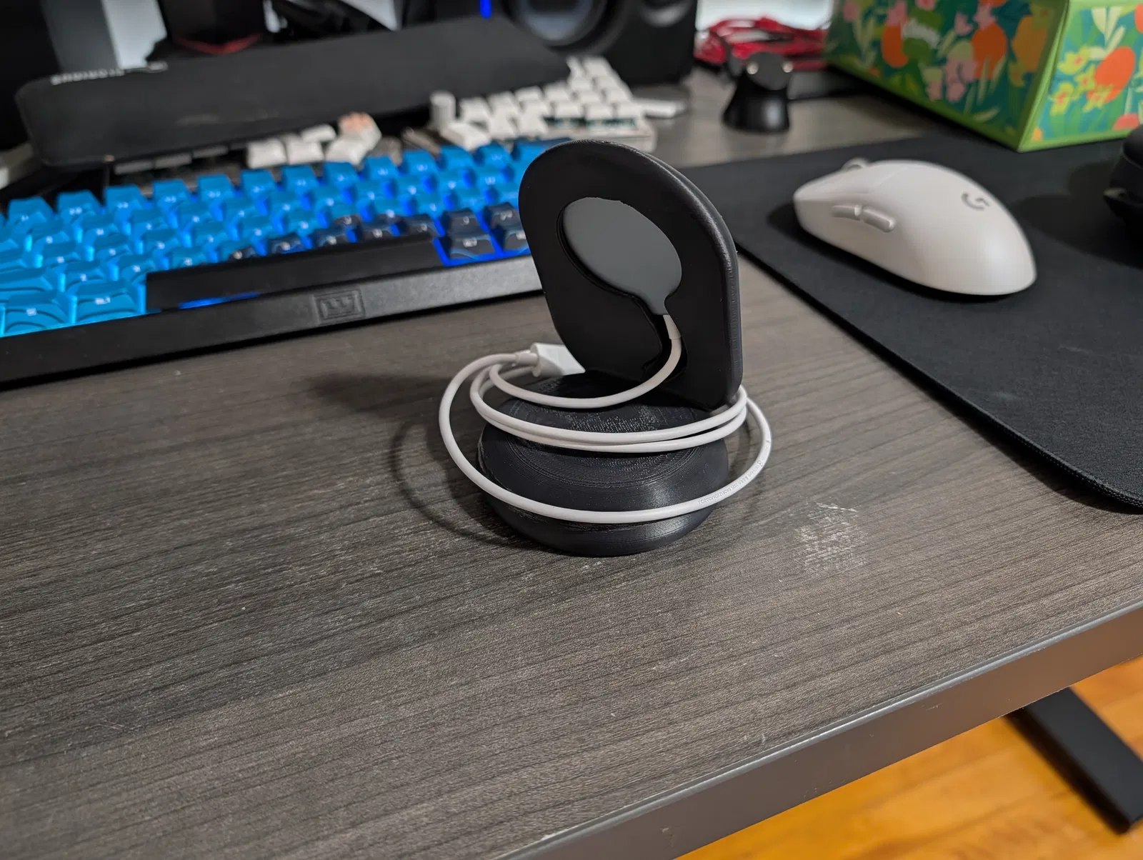 Giá đỡ cho Pixelsnap wireless charging puck của Google. Puck lắp khít, hơi nhô ra để sát máy; có thể pause ở cao 15–18mm để nhét thêm tạ. Có STL độ phân giải cao, kèm STEP và .f3d để chỉnh trong Fusion.