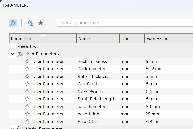 File .f3d cũng có sẵn nếu bạn muốn mở project gốc trong Fusion và chỉnh sửa gì đó. Mình đã cung cấp khá nhiều parameters để bạn tùy biến; nếu muốn sửa nhanh kích thước puck hoặc phần đế thì vào parameters editor (trong mục “Modify”).