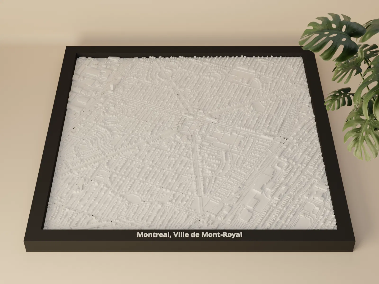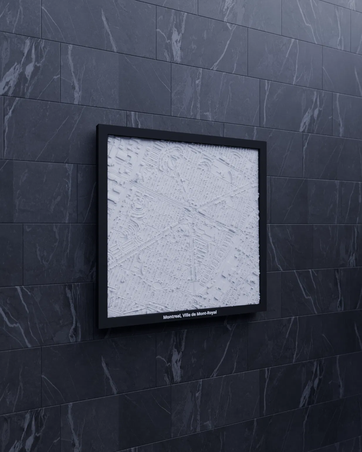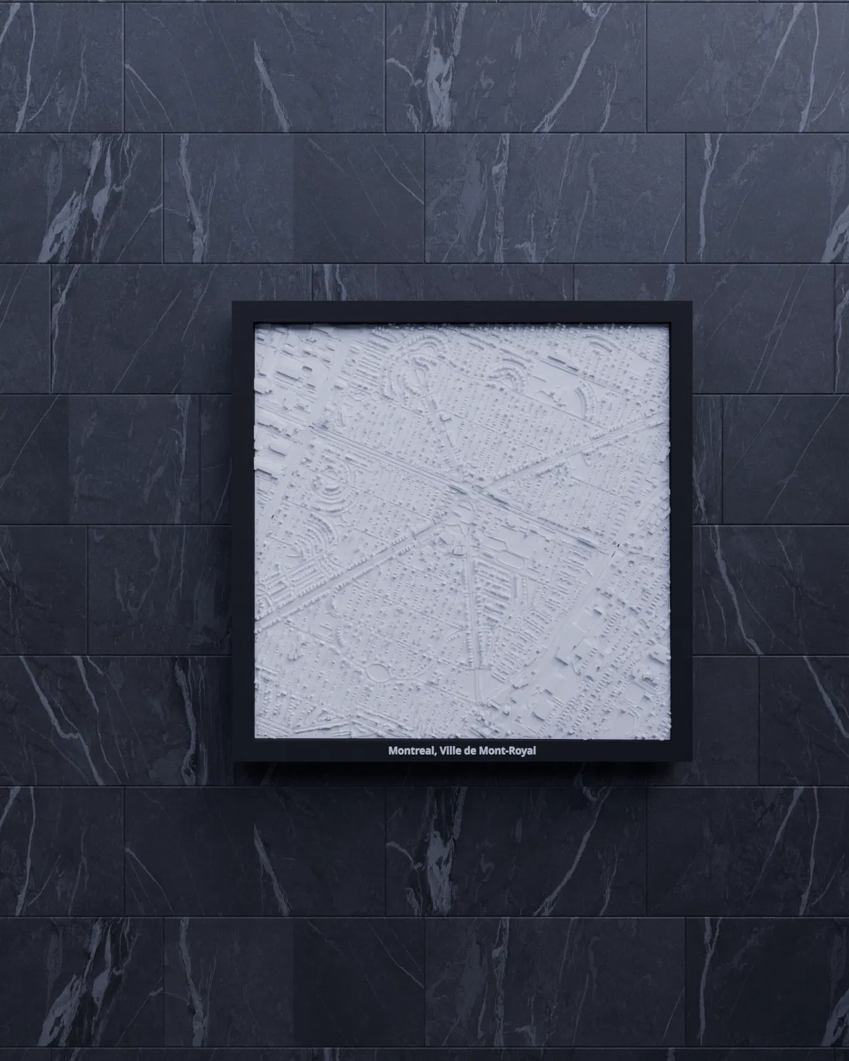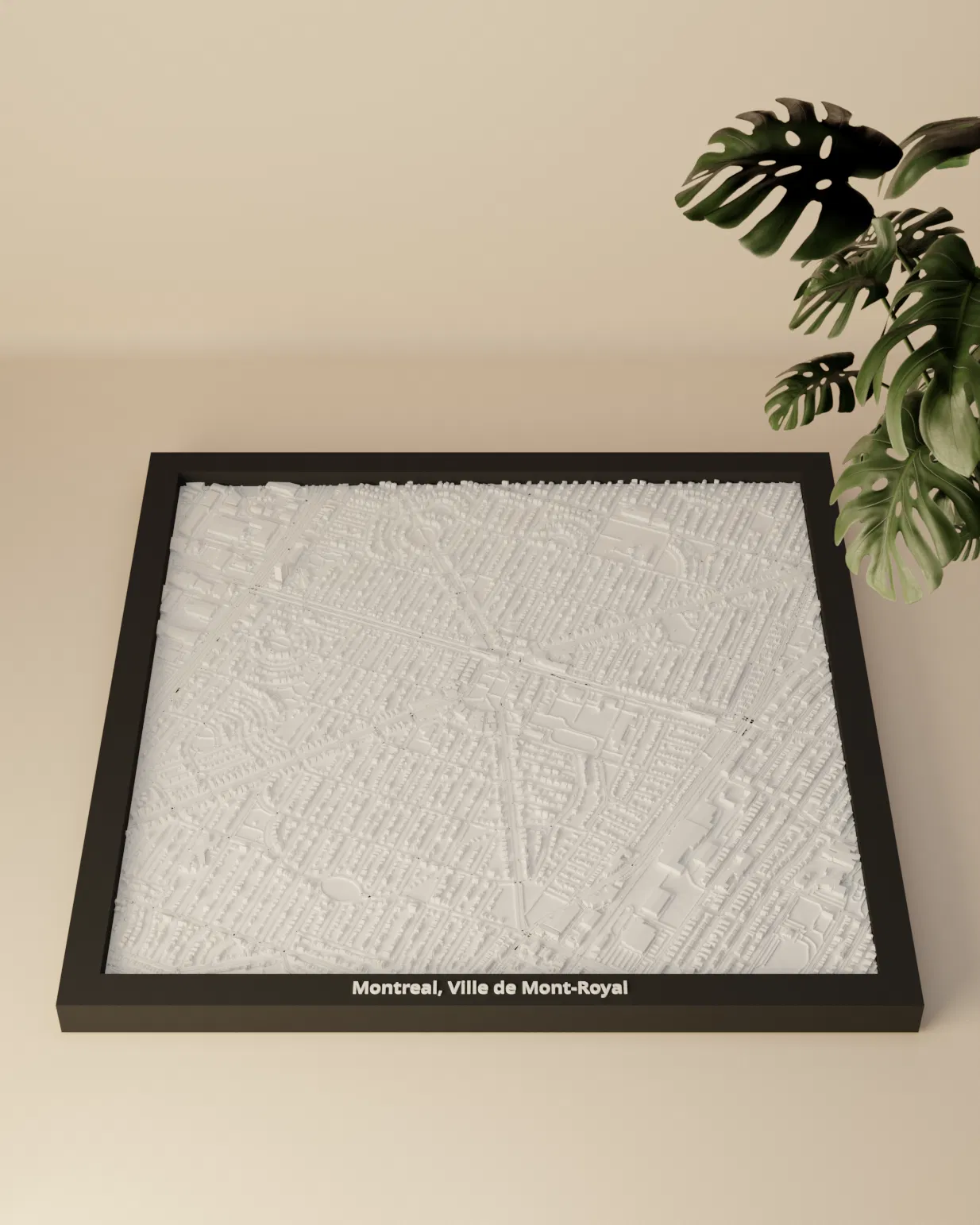 Mô hình địa hình thu nhỏ 3D của Montreal, Ville de Mont-Royal (Canada), dựng từ dữ liệu địa lý để tái hiện terrain chân thực. Kích thước in 200×200 mm, có nhiều frame kèm lỗ treo, phù hợp trưng bày hoặc quà tặng.