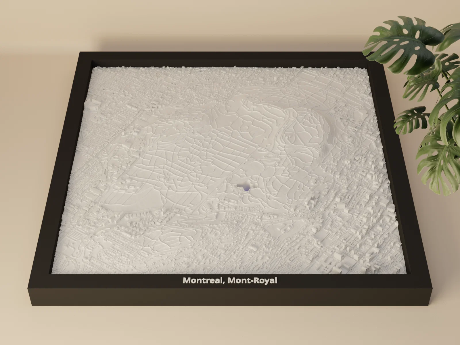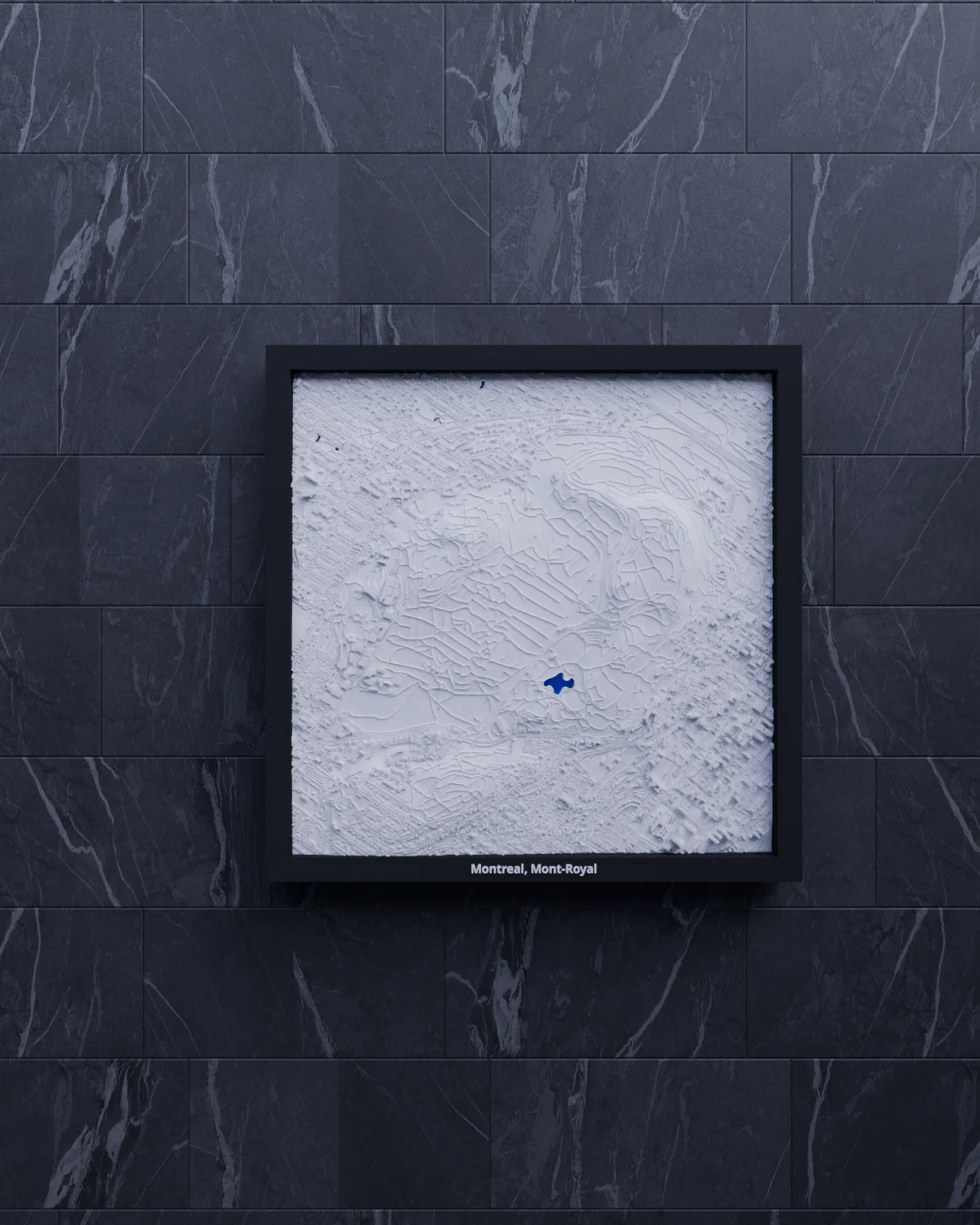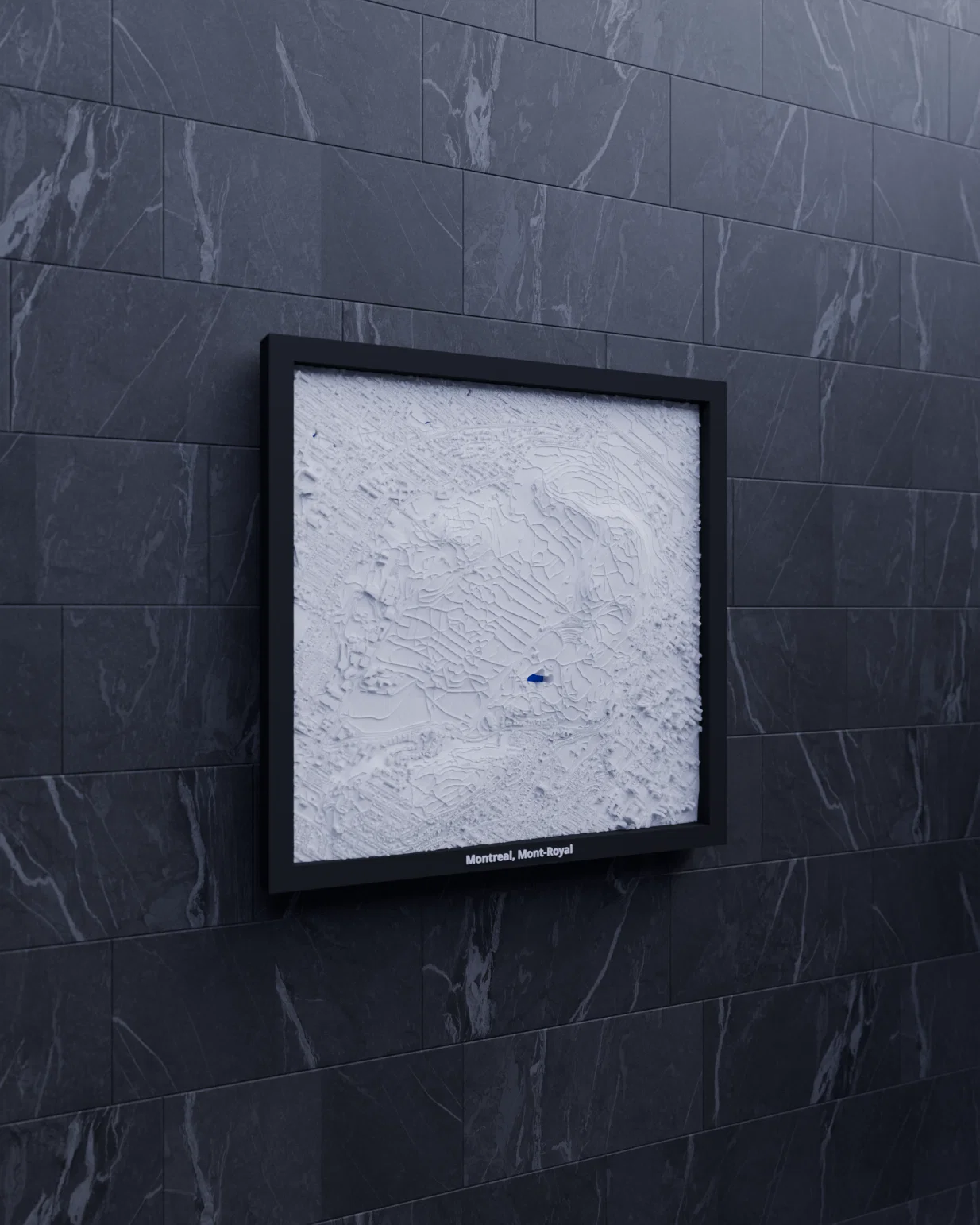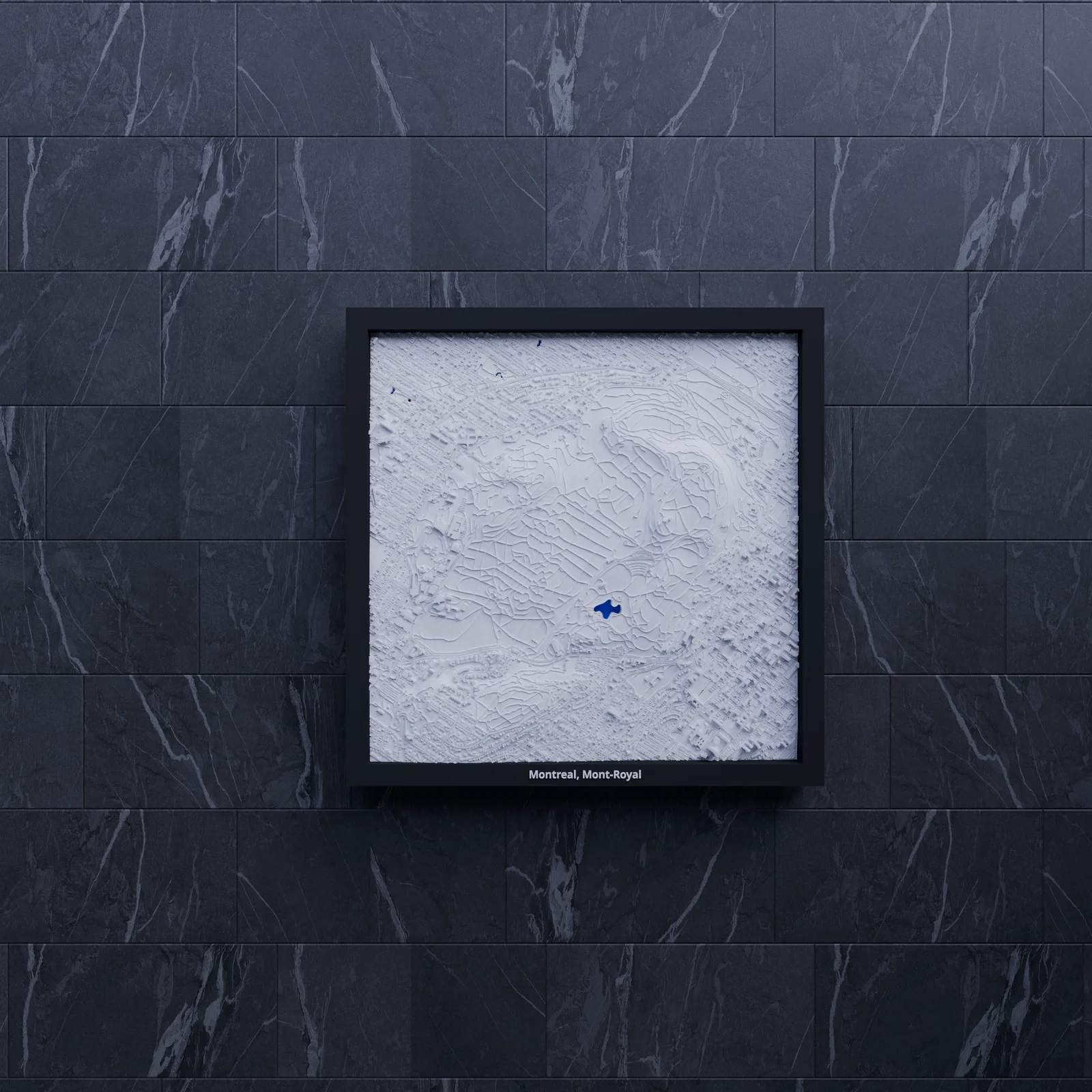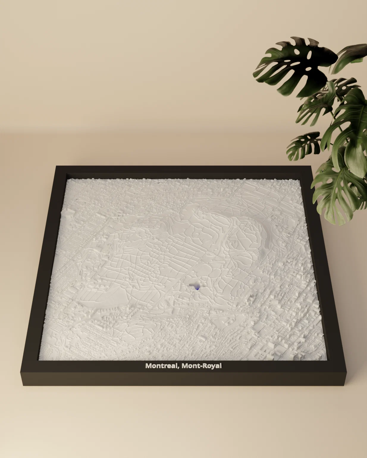 Mô hình mini địa hình 3D của Montreal, Mont-Royal (Canada), dựng từ dữ liệu địa lý để ra terrain chân thật. Thu nhỏ khu vực 3.426 x 3.414 km về kích thước in 200 x 200 mm, kèm nhiều lựa chọn khung có lỗ treo.