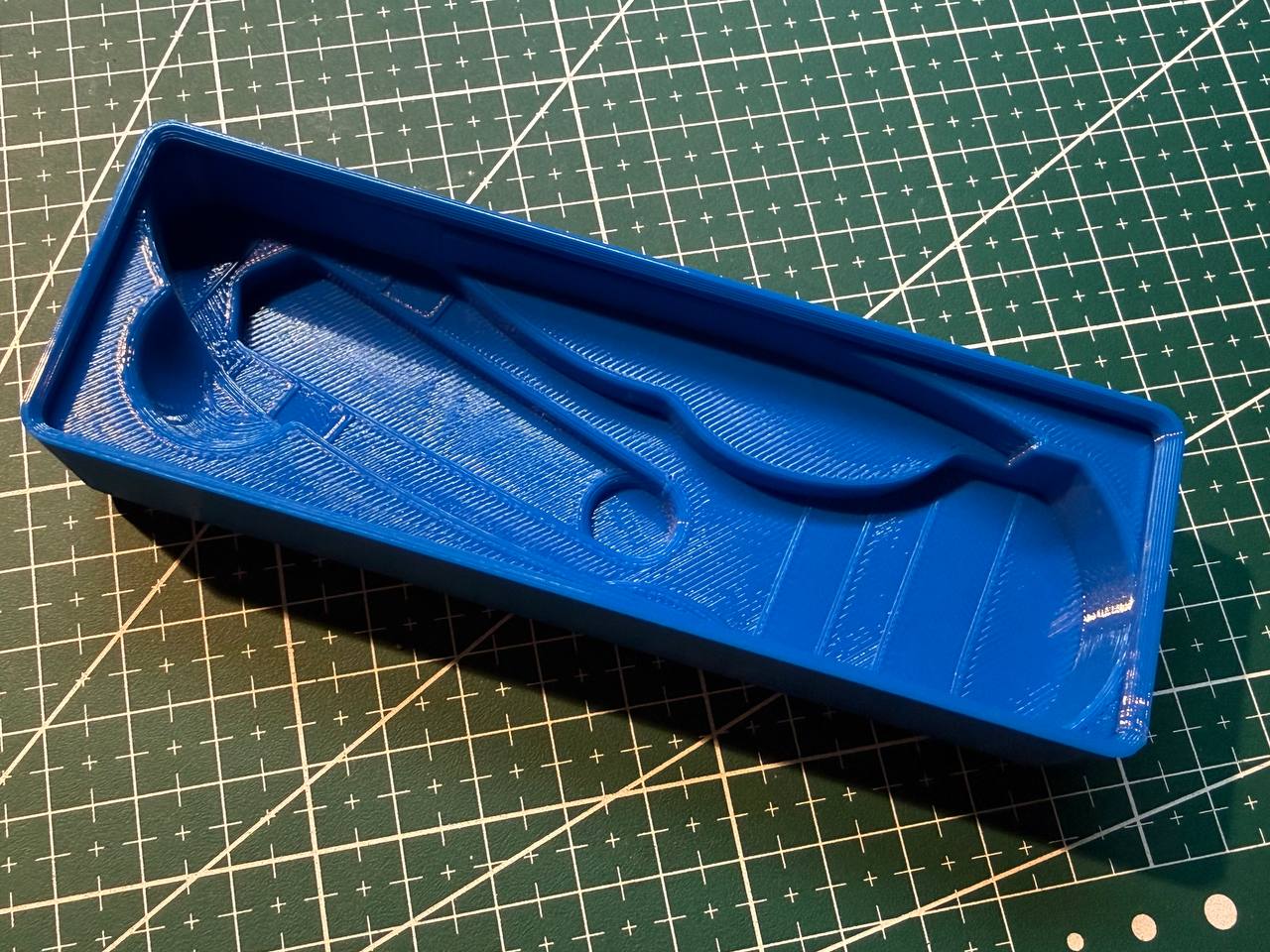 Bề mặt phía trên vẫn tương thích hoàn toàn với Gridfinity, nên bạn có thể xếp chồng các module khác lên trên. Khay được thiết kế với pocket clip gắn gần đầu hẹp của con dao.
