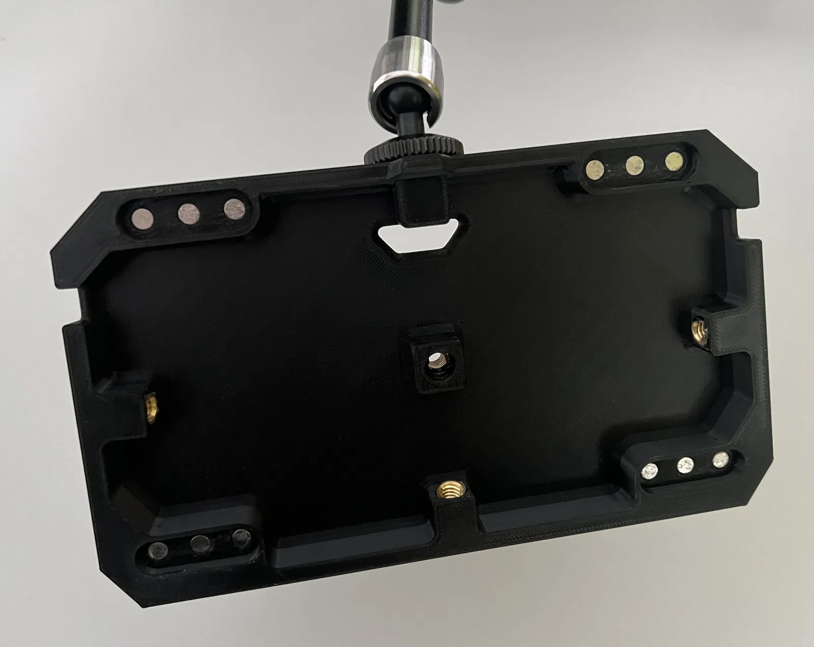Giá/đế gắn Stream Deck XL dùng ốc 1/4", cố định bằng 12 nam châm 5x2mm. Hỗ trợ 5 hướng lắp (trên/dưới/trái/phải/sau), cần threaded inserts 1/4" dài 12,7mm, dây đi được hai bên và phía sau.