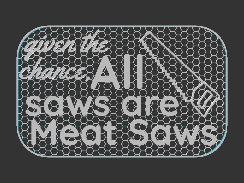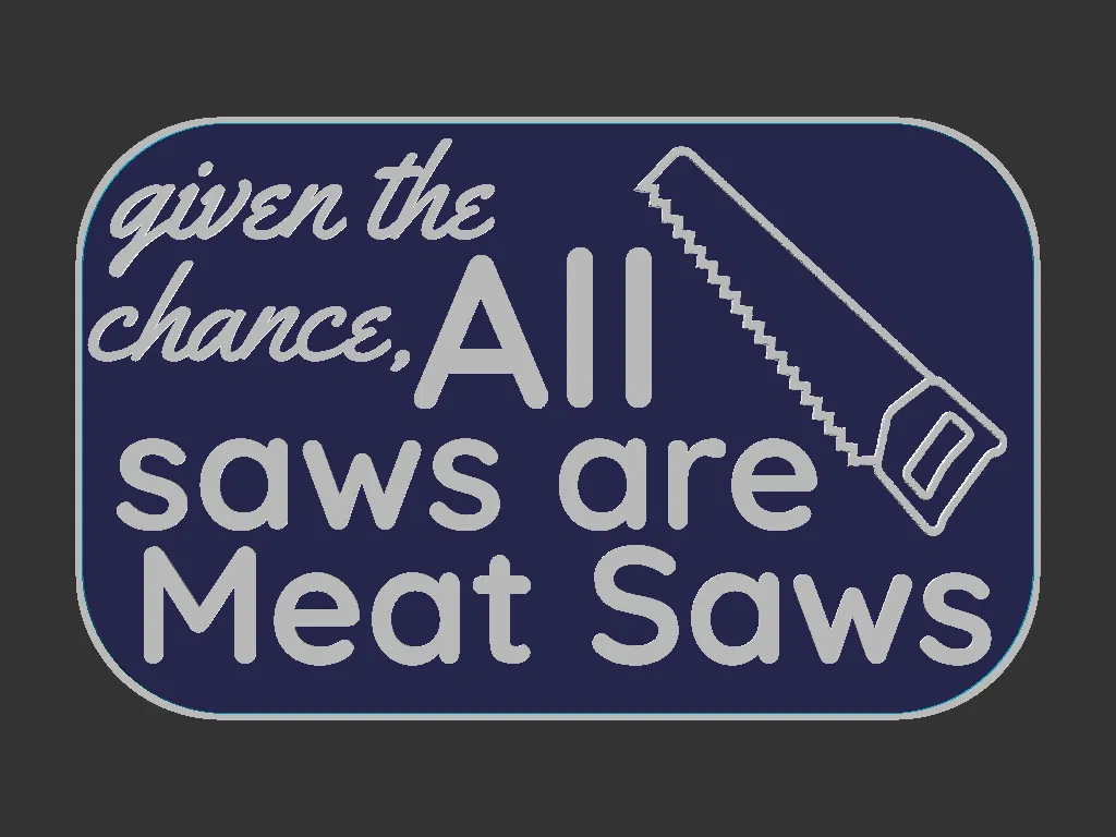 Biển 100x160mm với câu “Given the chance, all saws are Meat saws” và hình cưa thợ mộc. Có file Mesh và Solid, gợi ý đổi màu trên 1mm (kèm gcode). Có thể lắp vừa Shadowbox Frames.