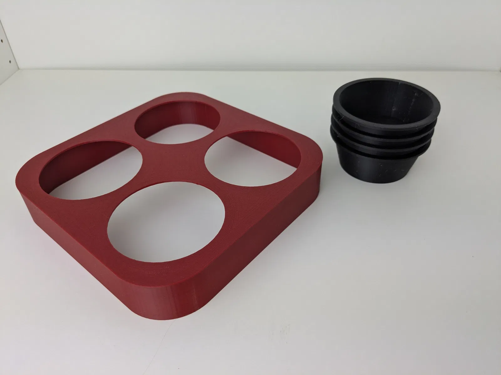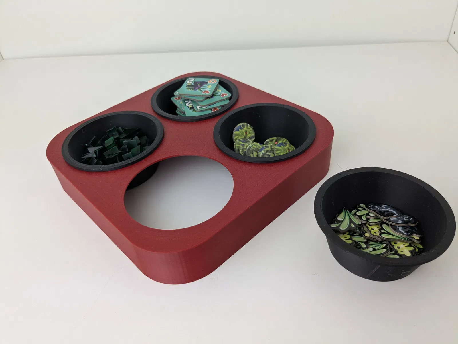 Bộ gồm 4 chén đựng token lòng bo tròn và 1 khay phẳng nặng, giữ chén khít để không trượt. Phù hợp token board game, coin, cube, resource bits và mini nhỏ; khuyến nghị in PLA/PETG, supports cho phần lip.