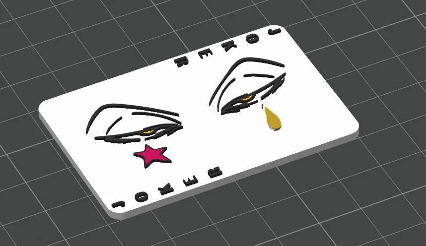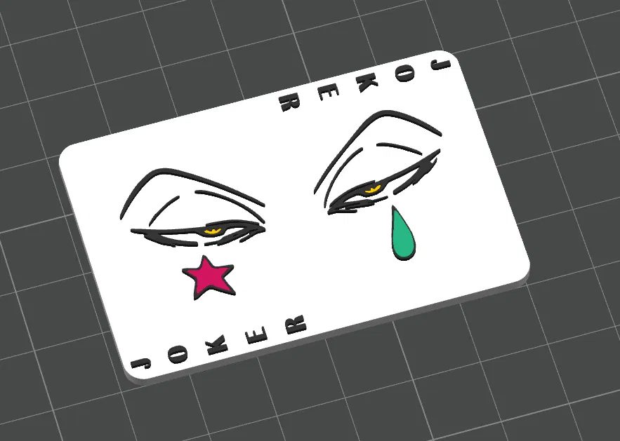 Mẫu Hisoka card dạng brooch: in nhiều màu, AMS 4 màu vẫn chạy được. Layer height 0.12; tạm dừng ở layer 21 để đổi filament vàng sang teal. Mặt sau chừa chỗ gắn kẹp cài 38×7×3 mm; size 66×44×4.70 mm.