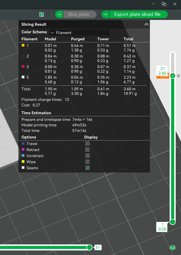 Bản in dùng 5 màu, nhưng AMS 4 màu là đủ. Chiều cao lớp (layer height) 0.12, với chiều cao lớp đầu (initial layer height) cũng 0.12. Tạm dừng in ở layer 21 rồi đổi filament màu vàng sang màu teal. Mặt sau có một vị trí để gắn kẹp cài brooch (38 × 7 × 3 mm). Kích thước: 66 × 44 × 4.70 mm