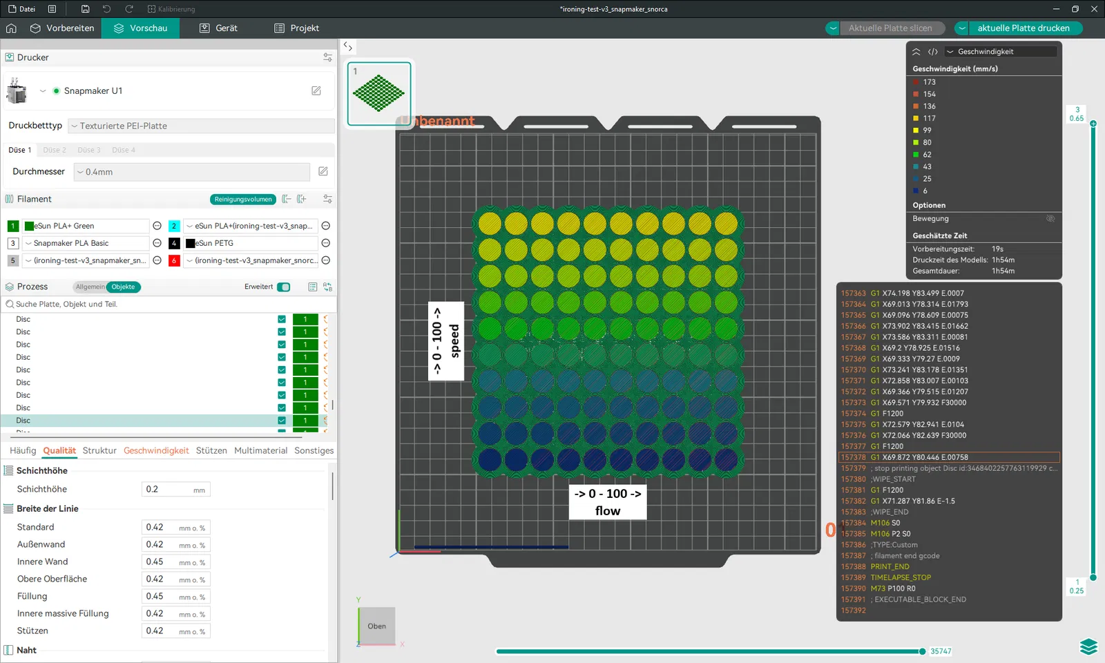 Chia sẻ thiết lập Orca Slicer đã chỉnh sửa để test Top Surface Ironing trên Snapmaker U1. Mẫu được in thử bằng eSun PLA+ và PETG để so sánh độ mịn bề mặt trên.