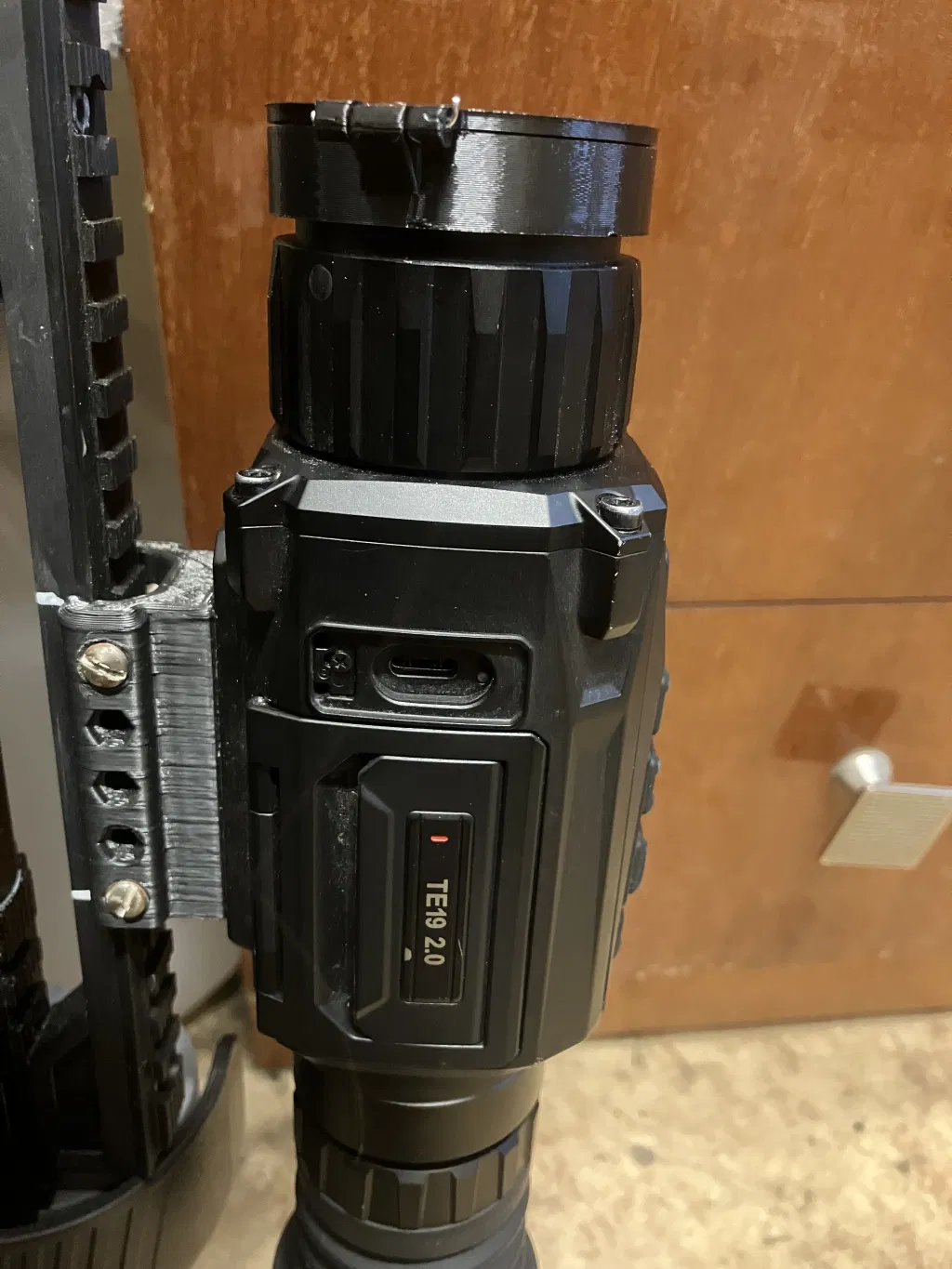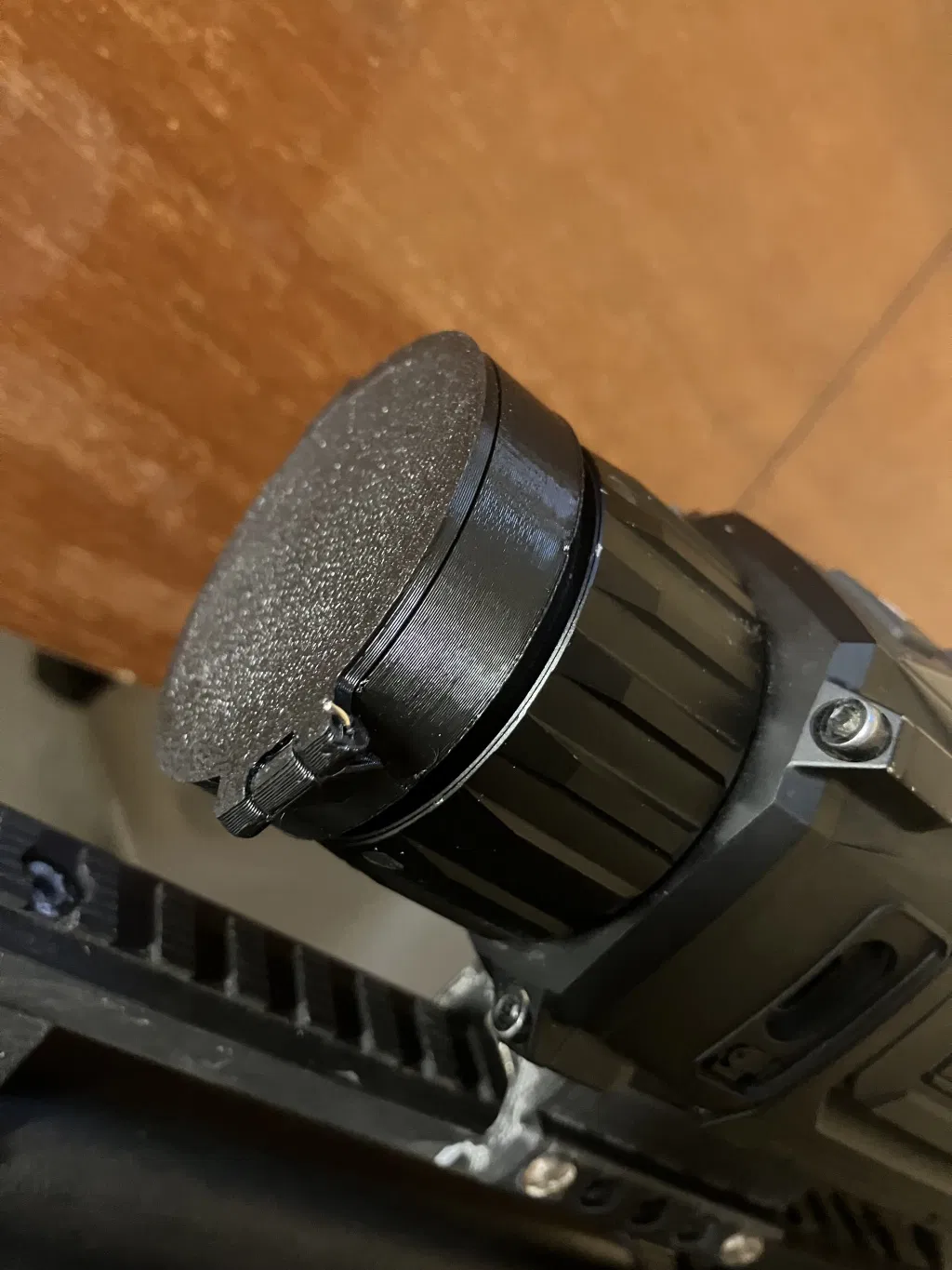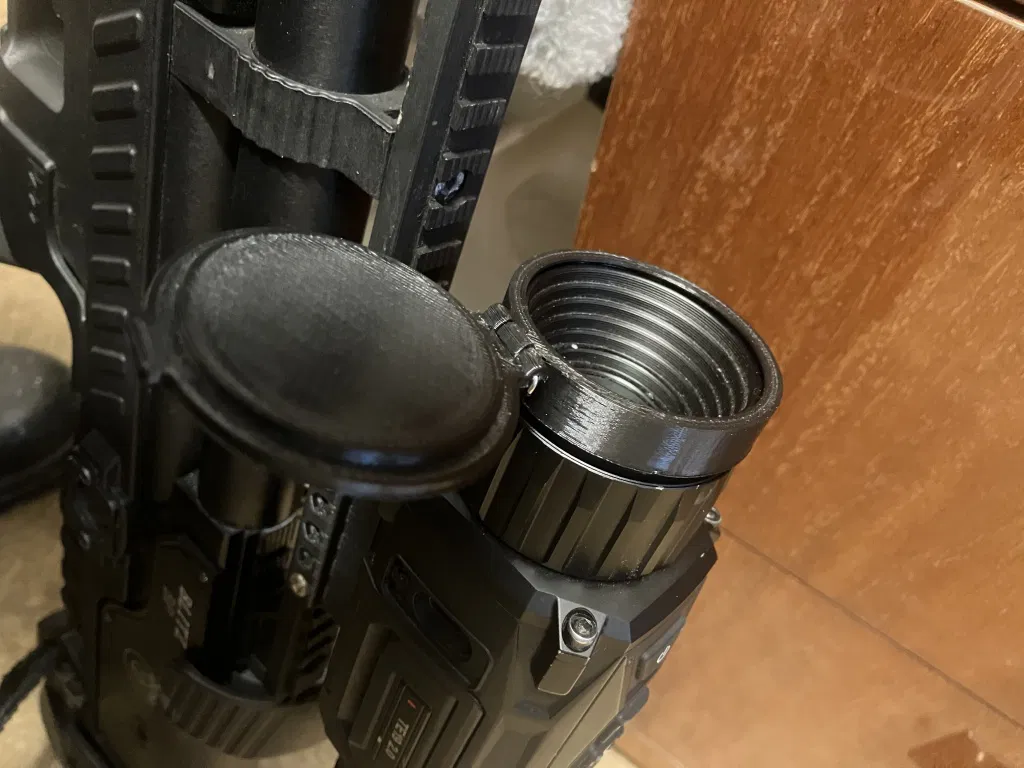 Nắp che thấu kính trước cho ống ngắm nhiệt HIKMICRO TE19 2.0. Đường kính trong 45.1 mm (cỡ 45 mm). In PET-G layer 0.2, không cần support. Sau in nên khoan/làm sạch lỗ pin; cần steel pin (bẻ đầu và cắt).