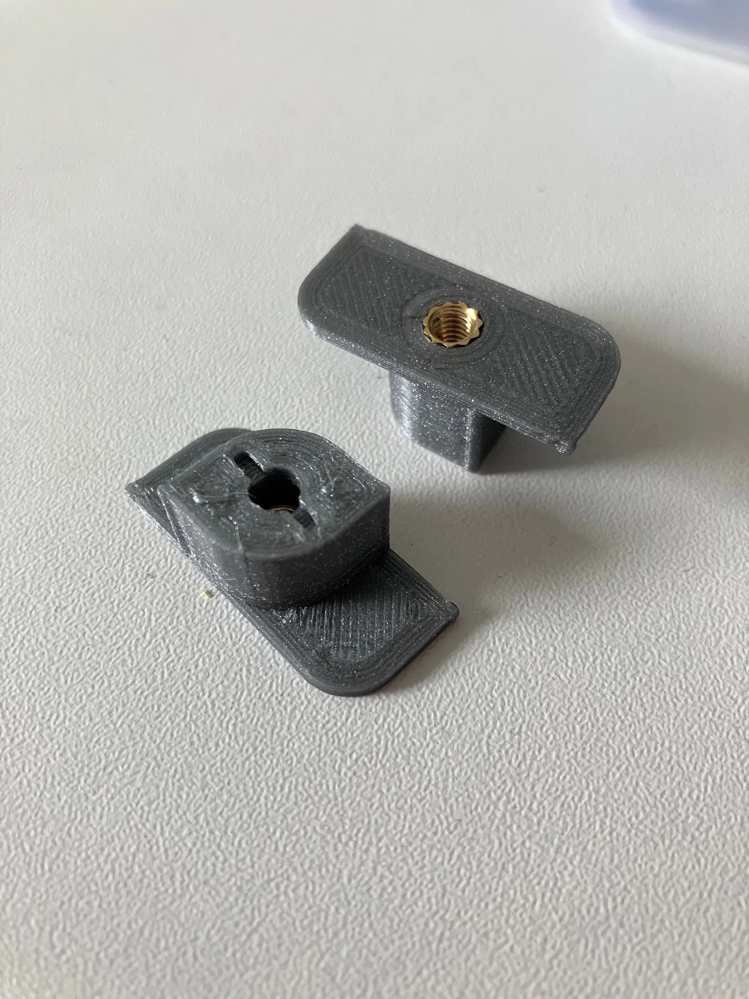 Giá đỡ gắn tấm tiêu âm (acoustic panel) dùng threaded heat insert M4x6x6, thiết kế adjustable. Tham khảo kích thước tấm 13 mm rộng, 10 mm cao. Có kèm model FreeCAD 1.0 để tự chỉnh theo tấm và insert thực tế.