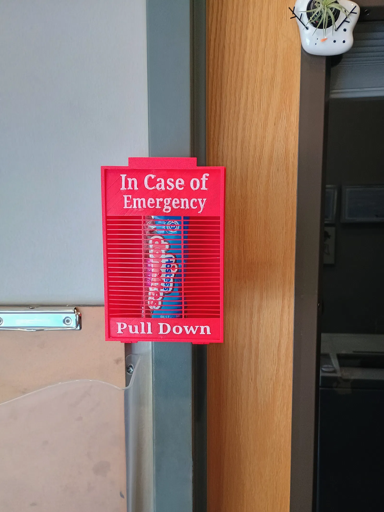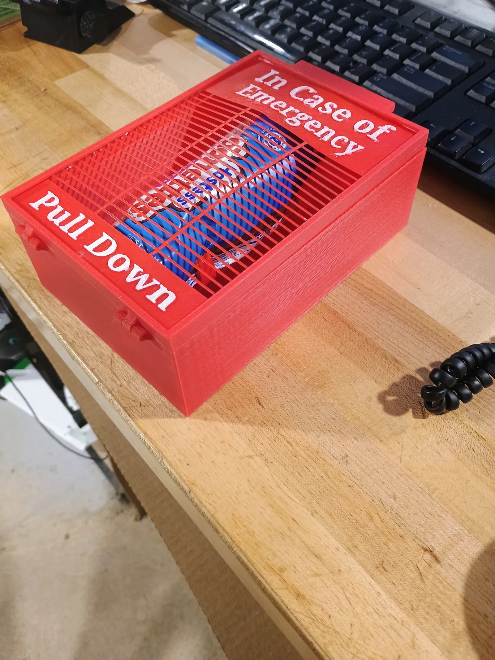 Emergency candy Box – hộp “In Case of Emergency” để đựng snack như Snickers king size hoặc mini donuts. Kẹp gắn bằng ốc M3, chốt bản lề dùng dây kẹp giấy (hoặc ốc M2). In Sunlu PLA+ infill 15%, chỉ cần supports dưới bản lề và latch.