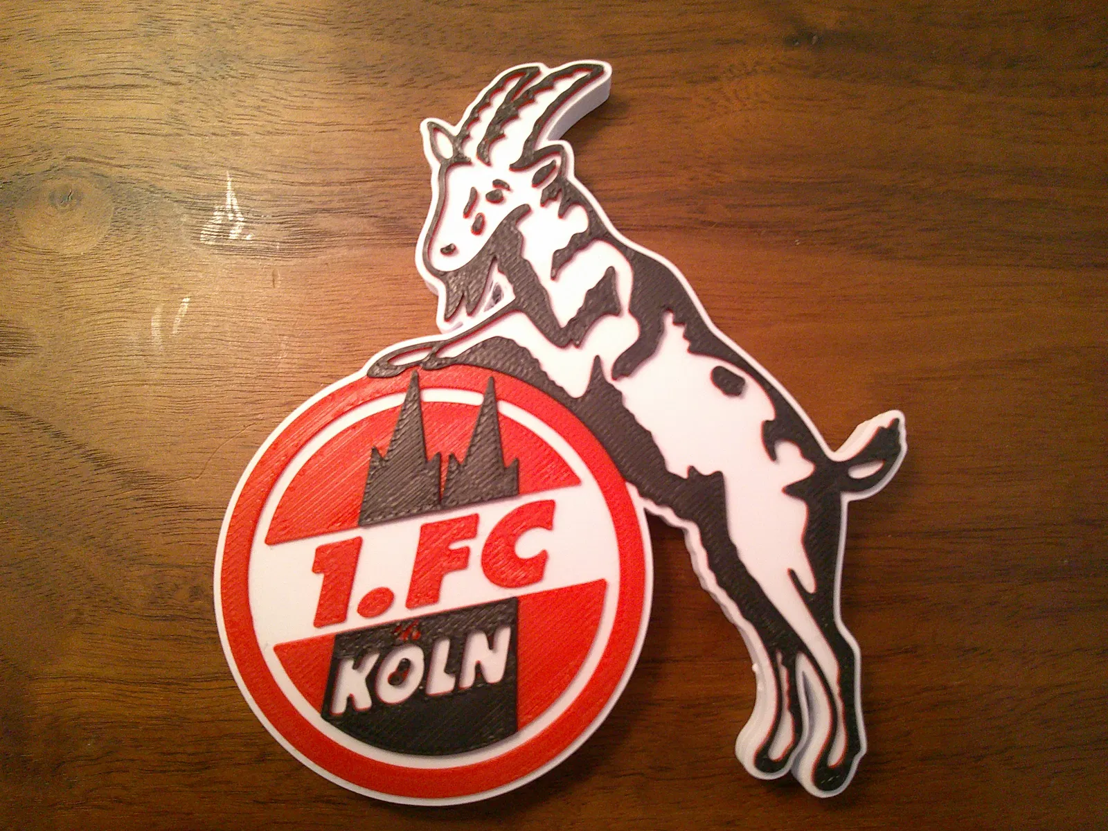 Mẫu lót ly hoặc bảng treo logo 1. FC Köln. Gợi ý in nhiều màu theo chiều cao lớp: trắng tới 6.2mm, đỏ tới 6.8mm, rồi hoàn thiện với màu đen. Phù hợp cho fan Bundesliga.