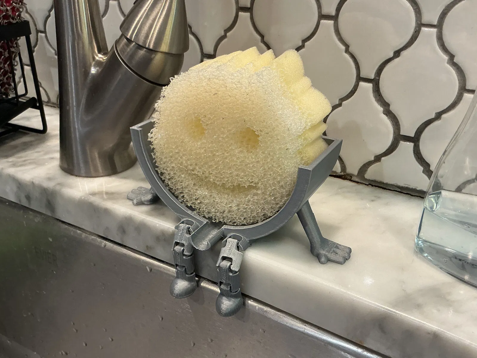 Giá để Scrub Daddy gác lên mép bồn rửa dạng print-in-place có khớp, tối ưu cho in FDM không cần supports. In khoảng 2.5 giờ, ~45g filament, có cổng thoát nước giúp ráo nhanh.