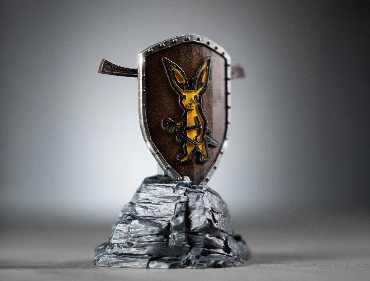 Mẫu có phần đế giả đá kèm chi tiết khiên hình thỏ, và một chuôi kiếm có thể tháo rời. Thiết kế đứng vững, chắc chắn, đặt lên kệ phòng tắm, bàn làm việc hay quầy lavabo đều vừa đẹp.