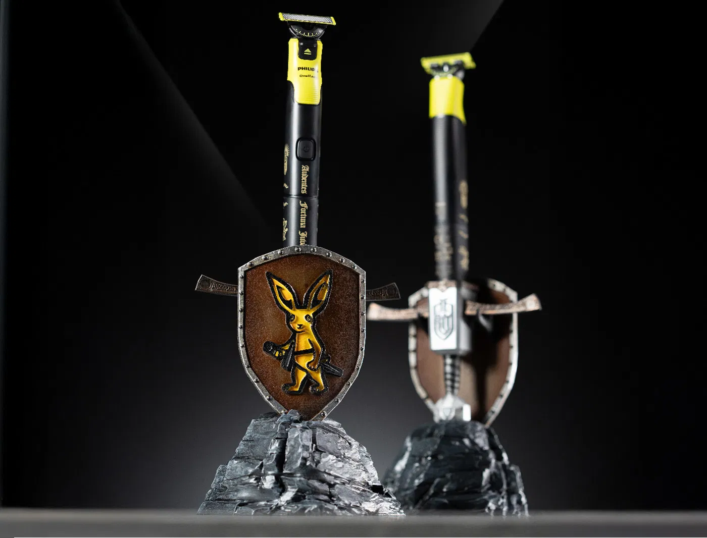 Giá đỡ lấy cảm hứng chuôi kiếm thời trung cổ cho Philips OneBlade 360 KCD2 Limited Edition. Đế giả đá kèm khiên thỏ, chuôi kiếm tháo rời; in PLA, lắp chắc, hợp kệ phòng tắm/bàn.