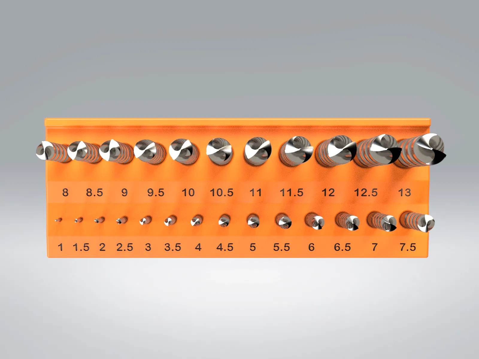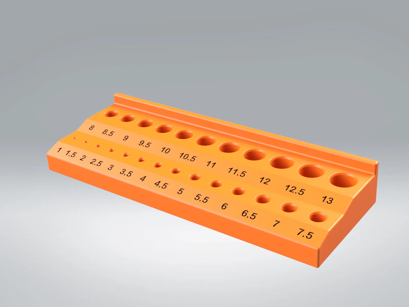 Giá đựng mũi khoan cho DIN 338 từ 1.0–13.0 mm, tăng theo bước 0.5 mm. Có ghi nhãn rõ từng cỡ, giúp sắp xếp mũi khoan gọn gàng, dễ nhìn và dễ lấy trong xưởng.